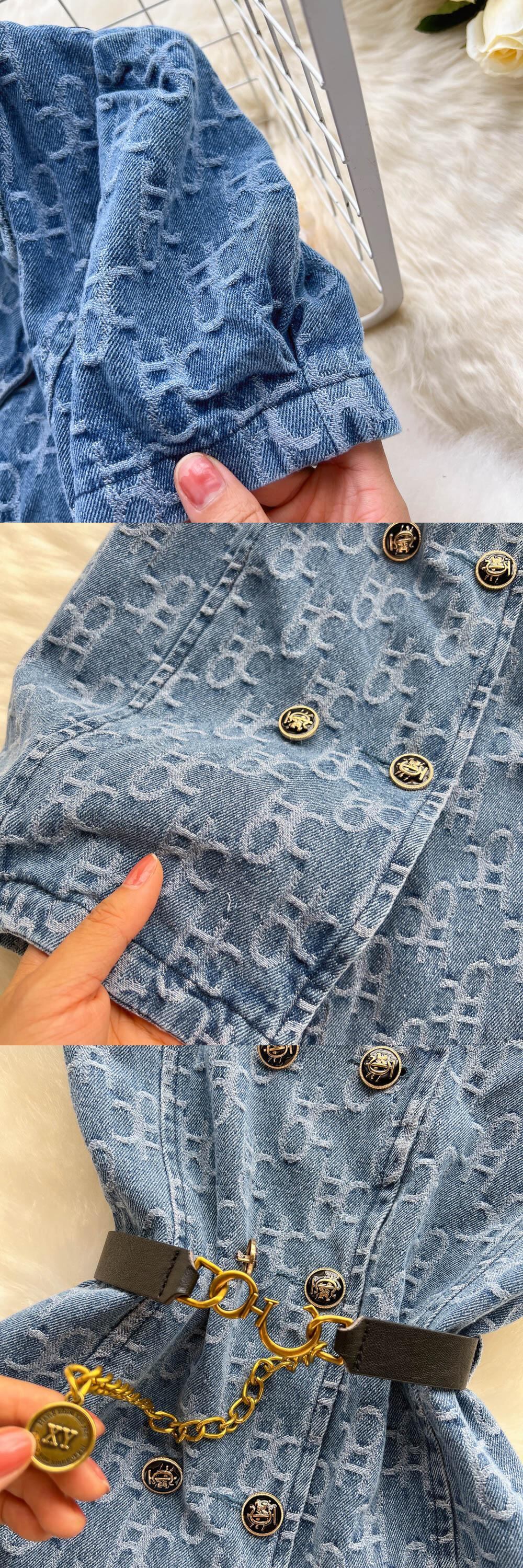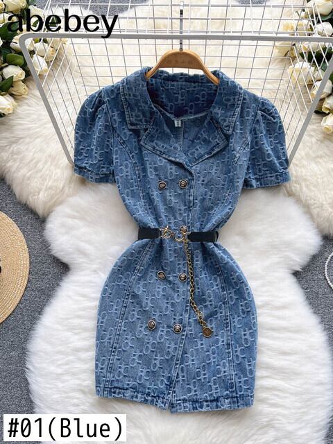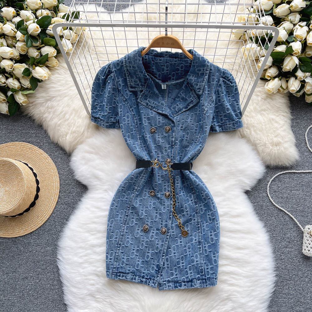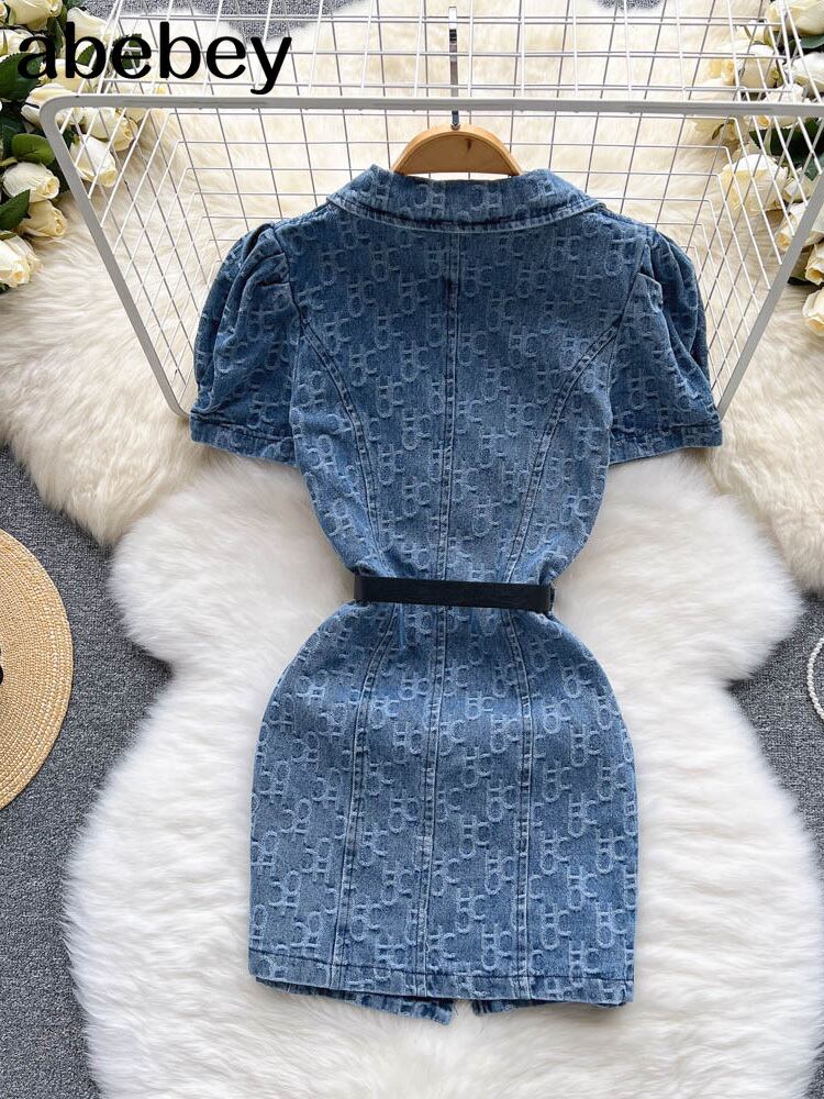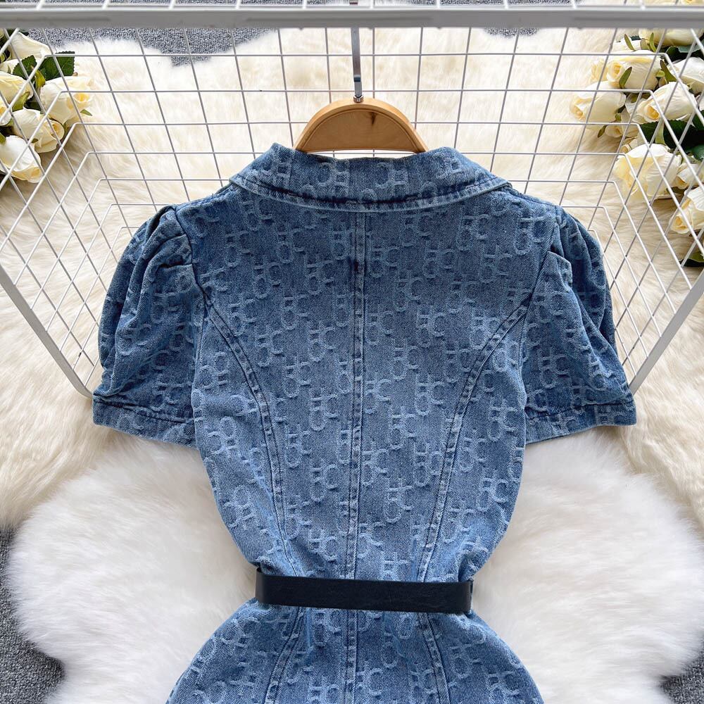 女性の A ライン ミニ デニム ドレス夏シングルブレスト ショート パフ スリーブ花柄スプリット ジーンズ ショート ドレス サマー 夏物 Aライン Abe51238682862