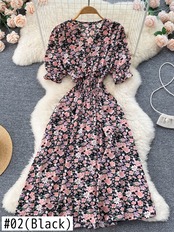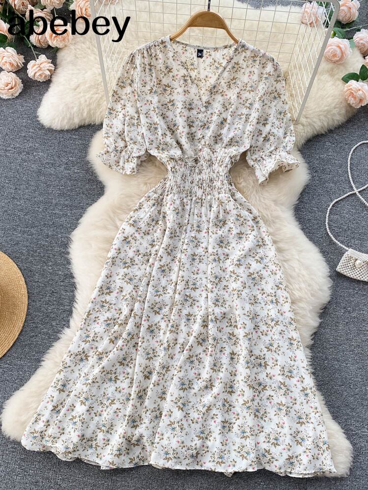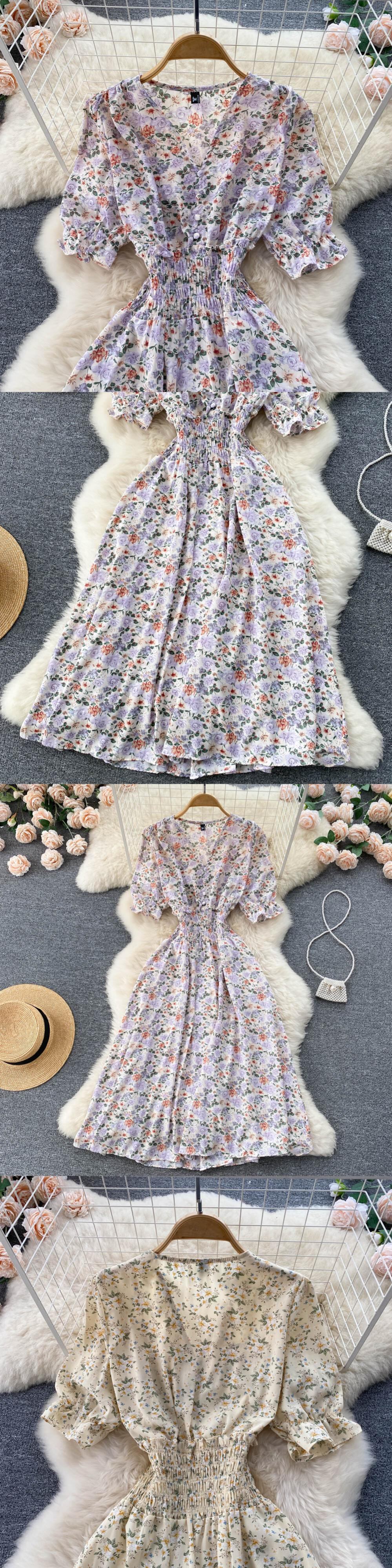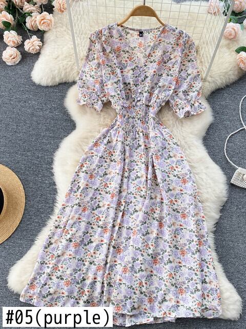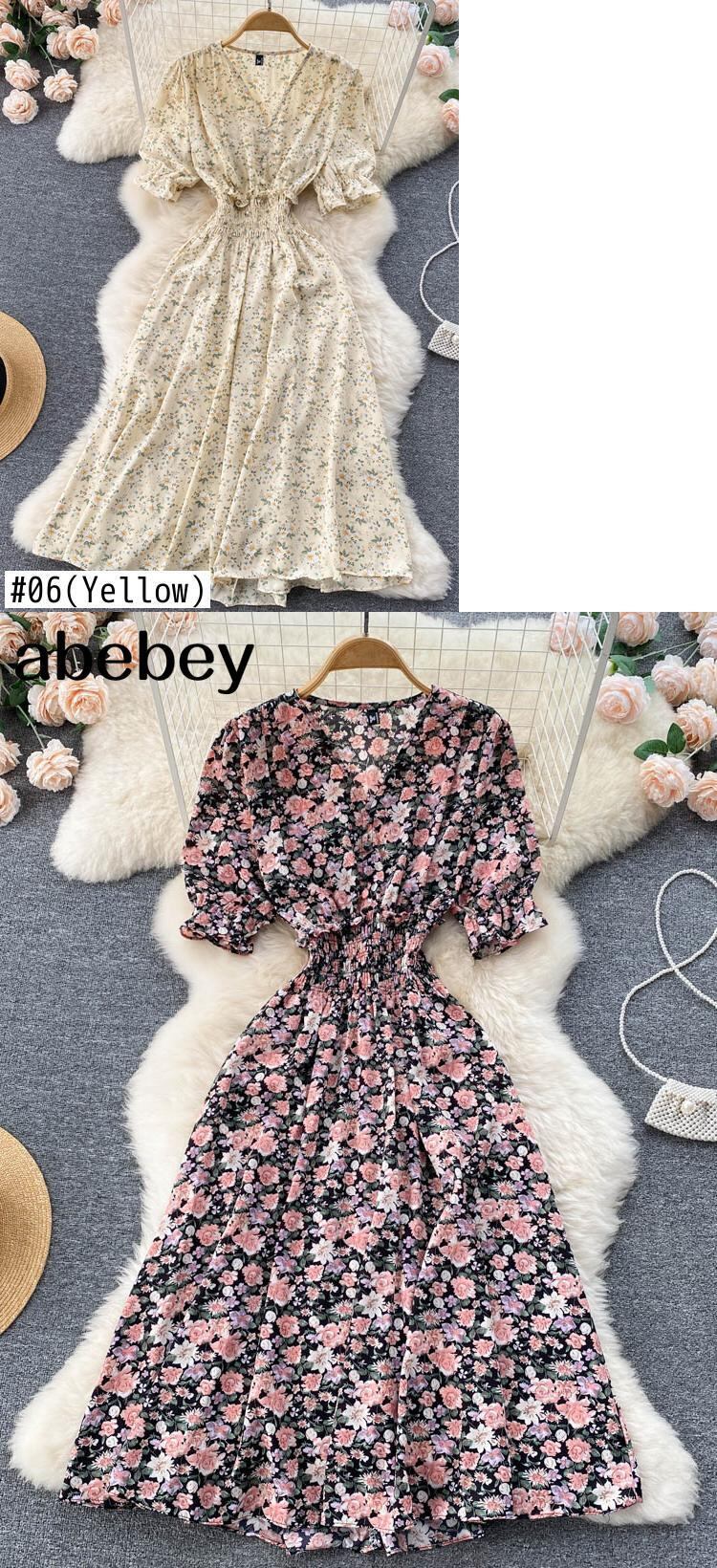 ボタン花柄 V ネック ロング ドレス夏パーティー弾性ウエスト ドレス女性エレガントなチュニック スプリット ビーチ ドレス エラスティック 伸縮 サマー 夏物 Vネック Abe6021608877