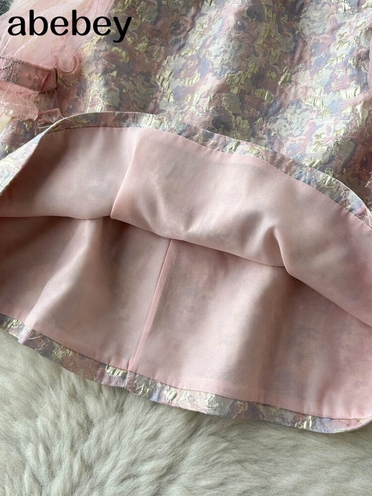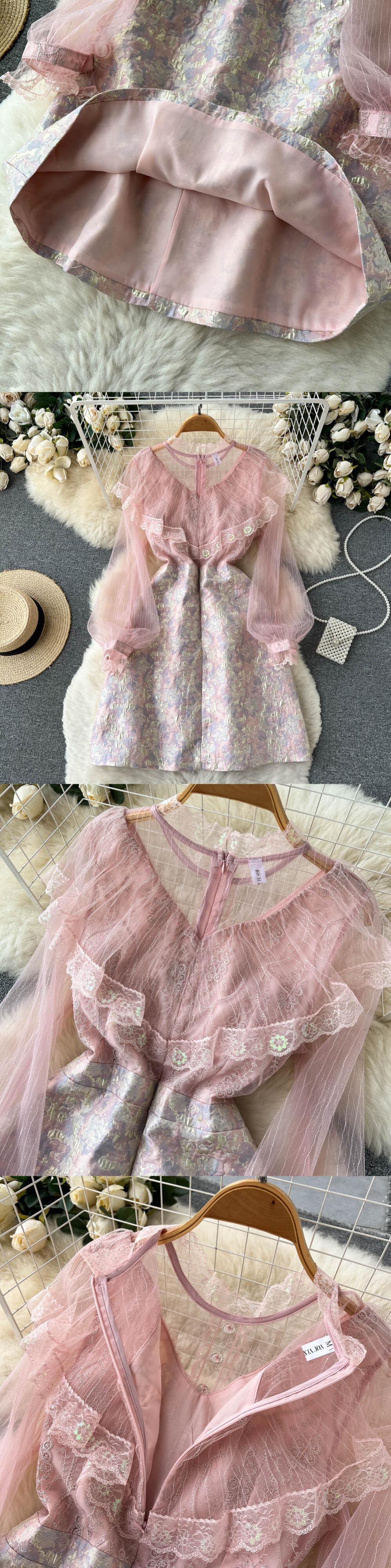 女性ランタン スリーブ スリム ビーズ レース パッチワーク ドレス滑走路フリル ピンク ツイード ドレス Vestidos ランタンスリーブ ラッフル Abe38702951893