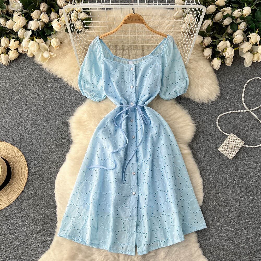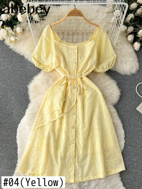 Vingate 刺繍スクエアカラーレースドレス女性パフスリーブフローラルシックなドレスボタン夏 2022 サマー 夏物 花柄 スクウェア Abe30914204051