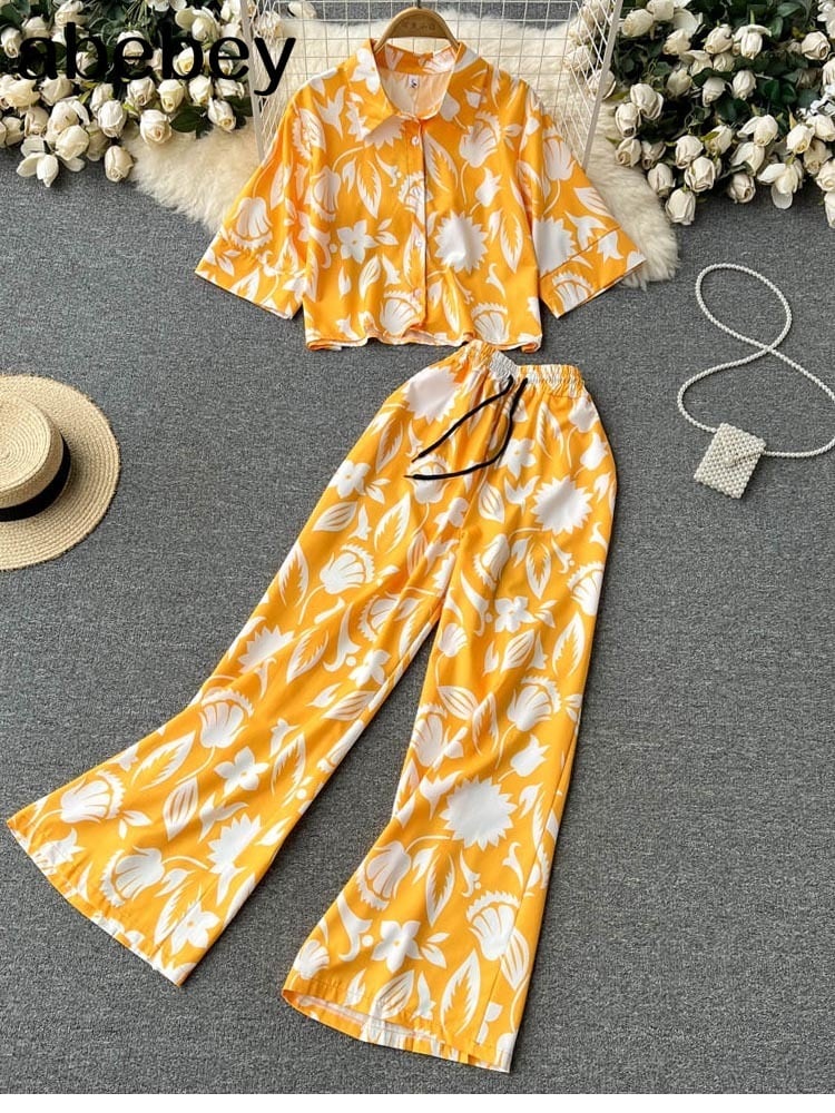 女性の夏のツーピーススーツ半袖ショートトップ + ワイドレッグロングパンツストリートスーツツーピースセット ハーフスリーブ サマー 夏物 ワイドパンツ Abe86186866775