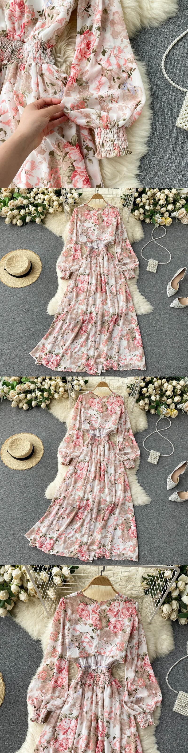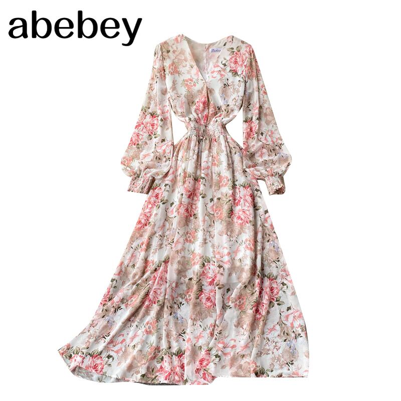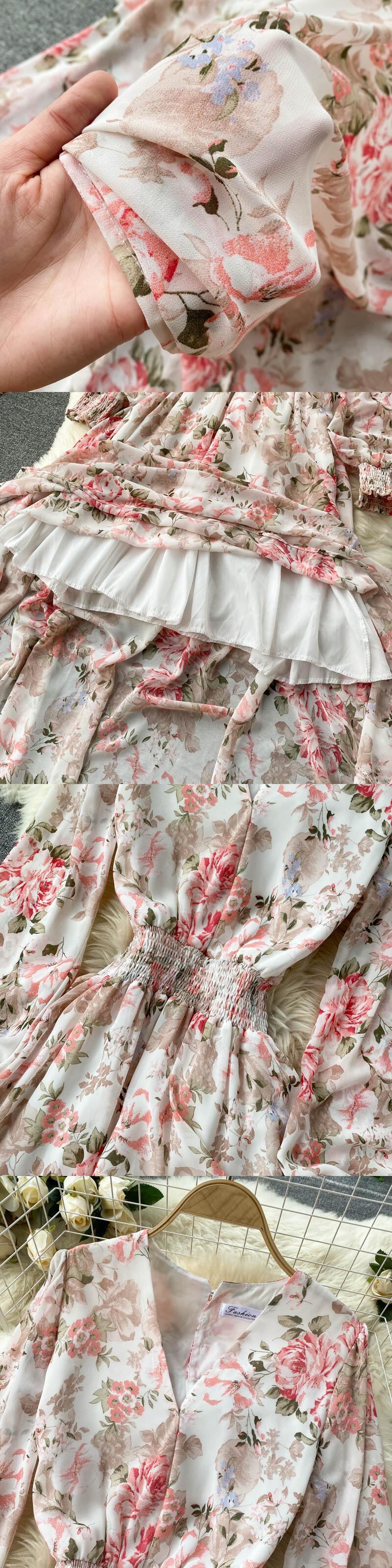 女性ボヘミアン花柄ドレス パフ スリーブ V ネック A ライン ドレス春休暇プリント フリル ロング ドレス ラッフル スプリング 春物 Vネック Aライン Abe90055736583