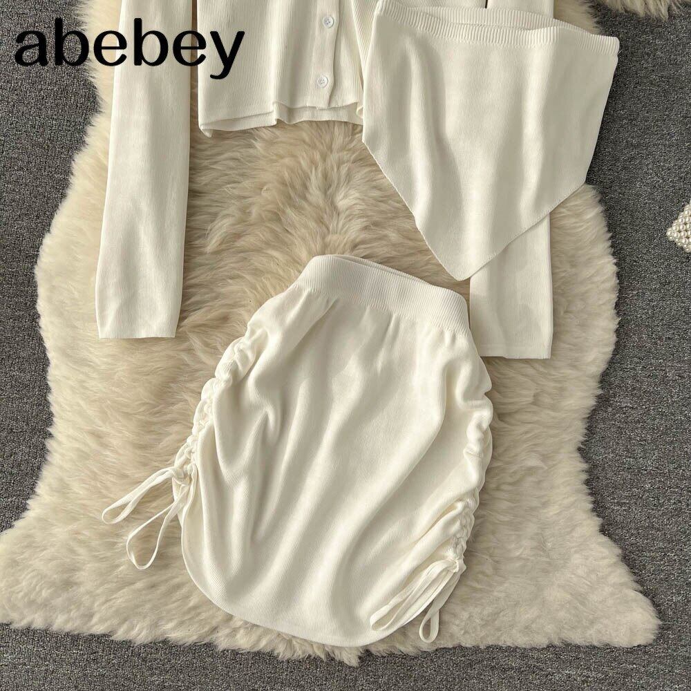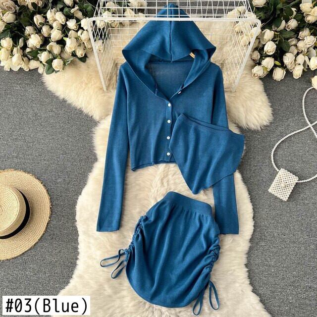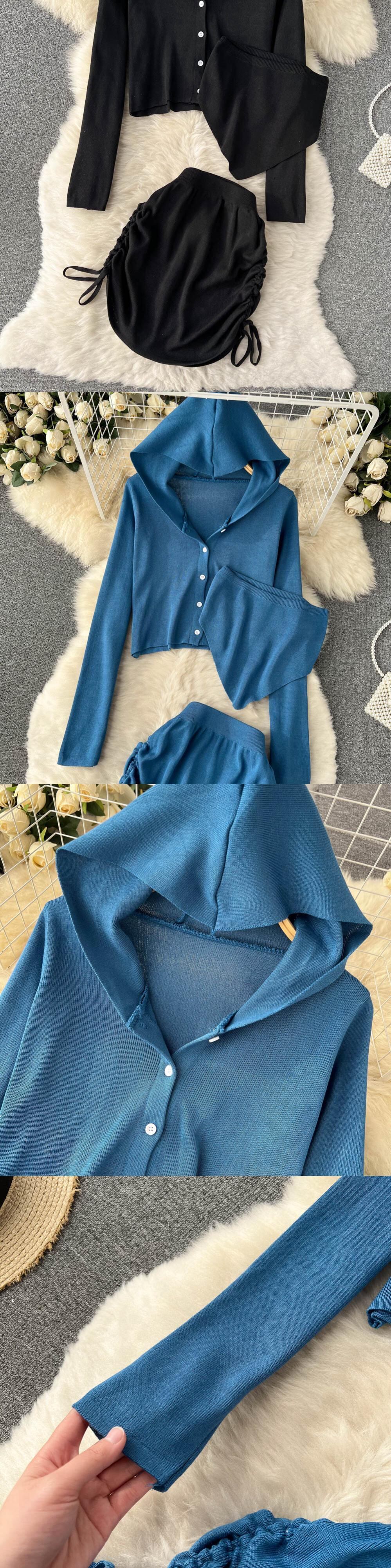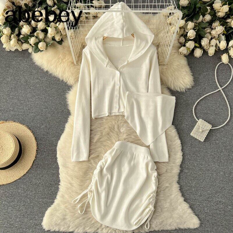 2022 春ニットスリーピースセット女性ショートフード付きカーディガン + セクシーなスリムストラップレストップス + 巾着ミニスカートセット スプリング 春物 Abe48021413034