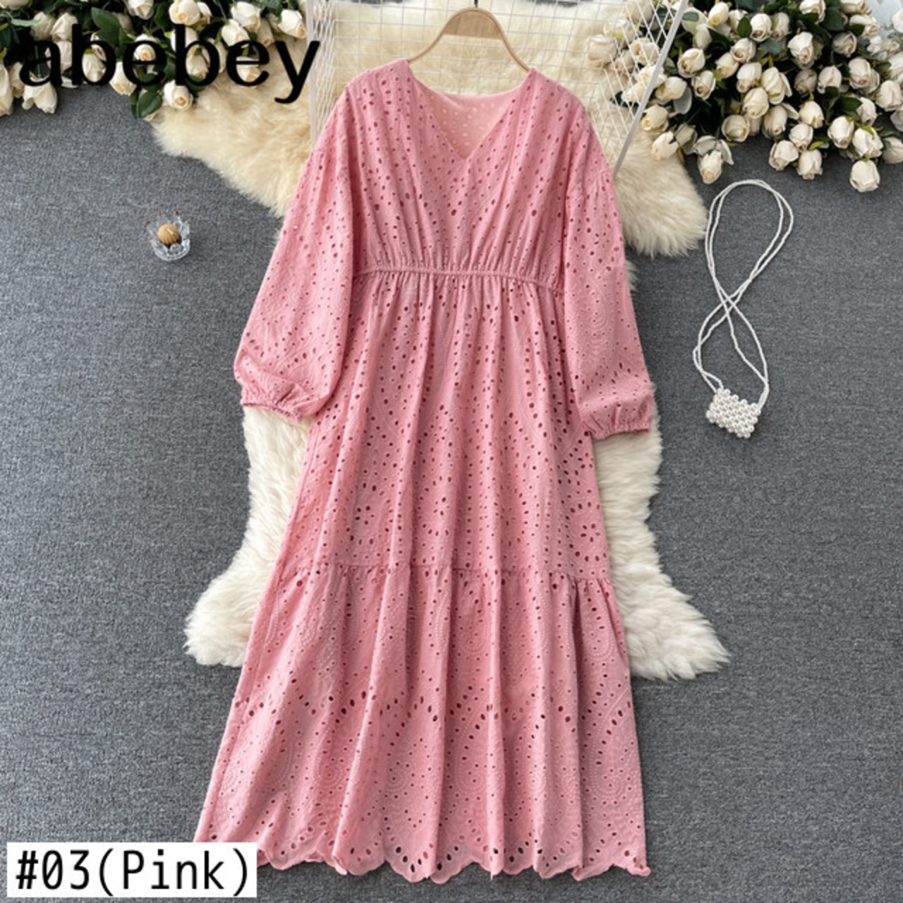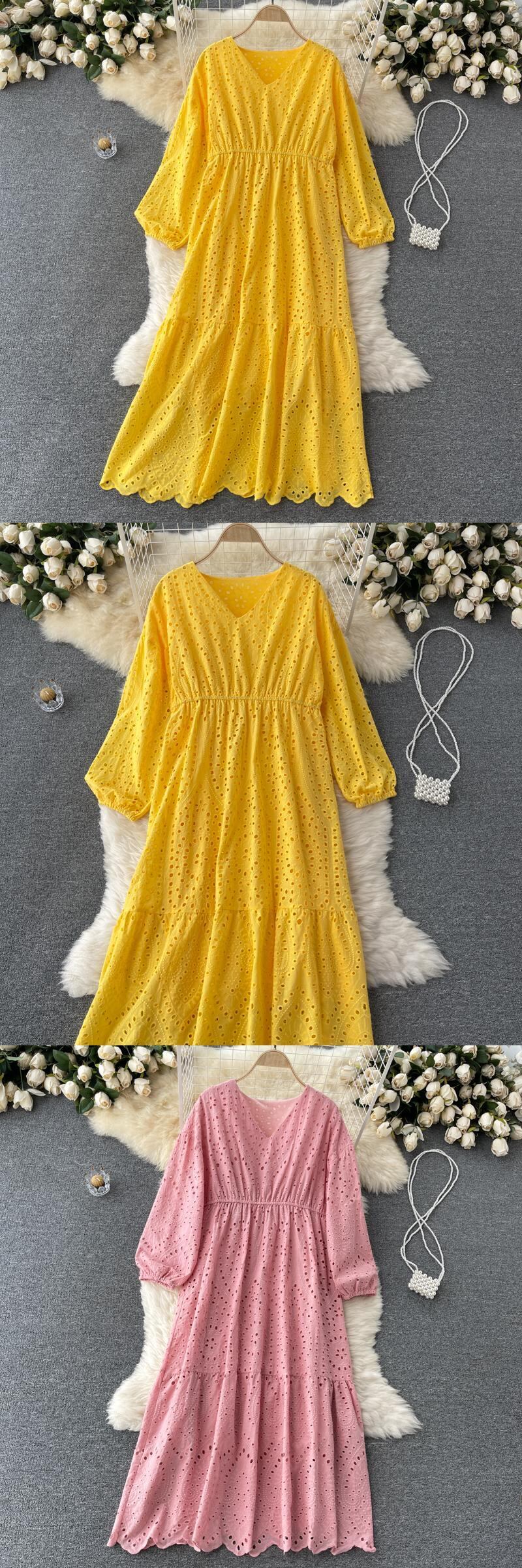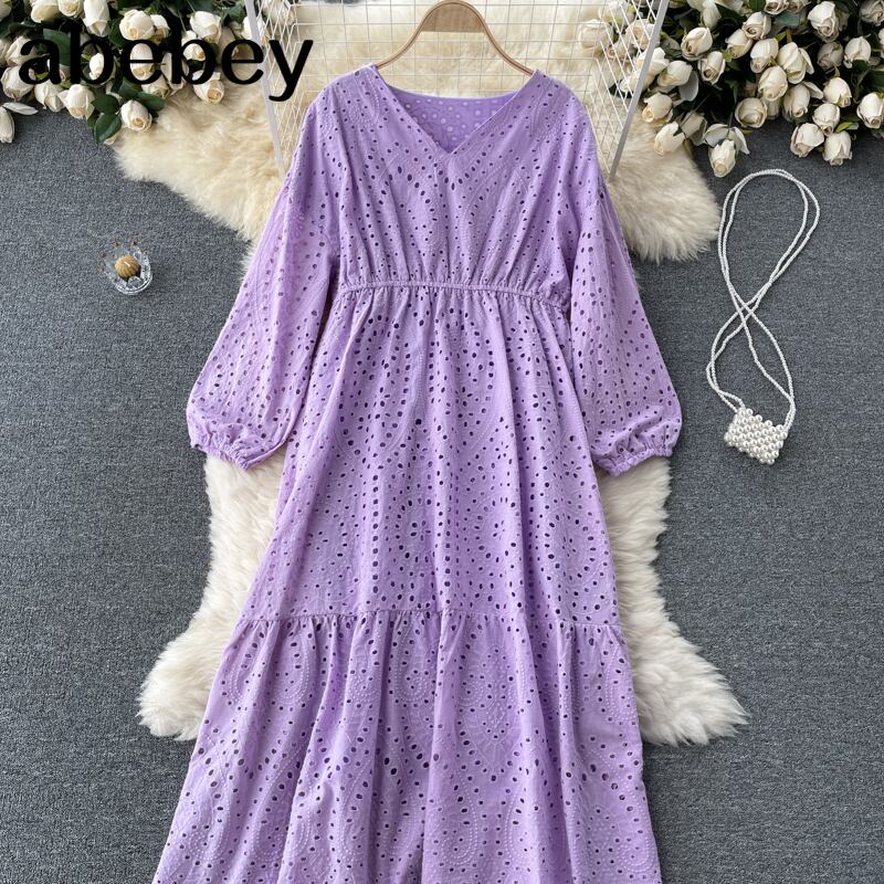 イエロー/パープル/ブルー中空アウト ミディ ドレス女性パフ長袖ルーズ刺繍 Vestidos 春秋 ロング レッド スプリング 春物 オータム 秋物 Abe75696959005