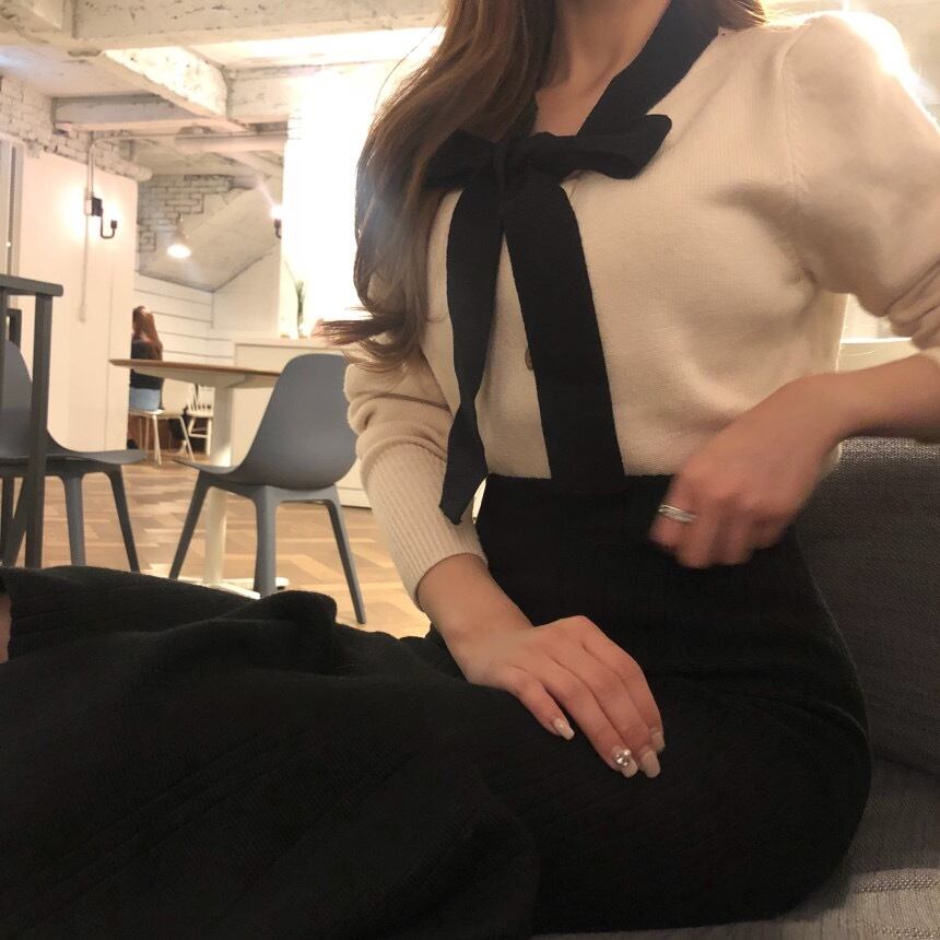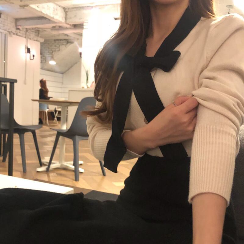 女性のセーターのシックな秋の対照的な色のレースアップ弓緩い痩身長袖カーディガン ロング リボン オータム 秋物 Abe11827732170