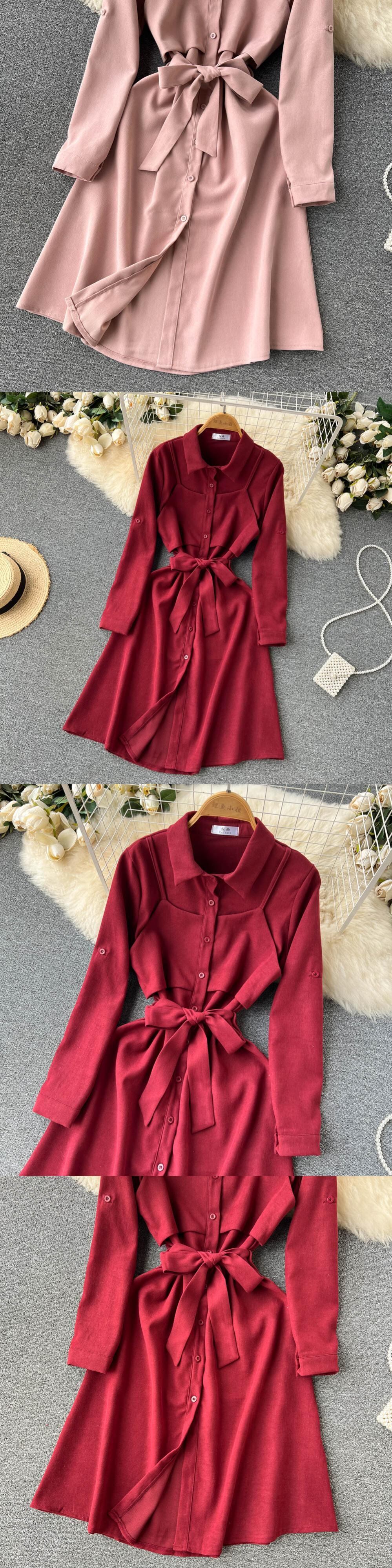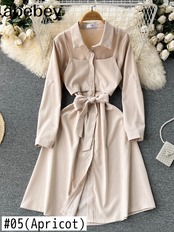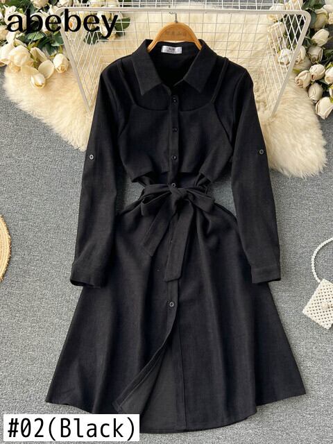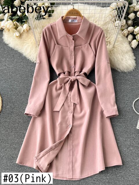 秋の女性のソリッドロングドレスターンダウン襟シングルブレストウエスト A ラインマキシ Vestidos オータム 秋物 Aライン ソリッドカラー Abe58191219166