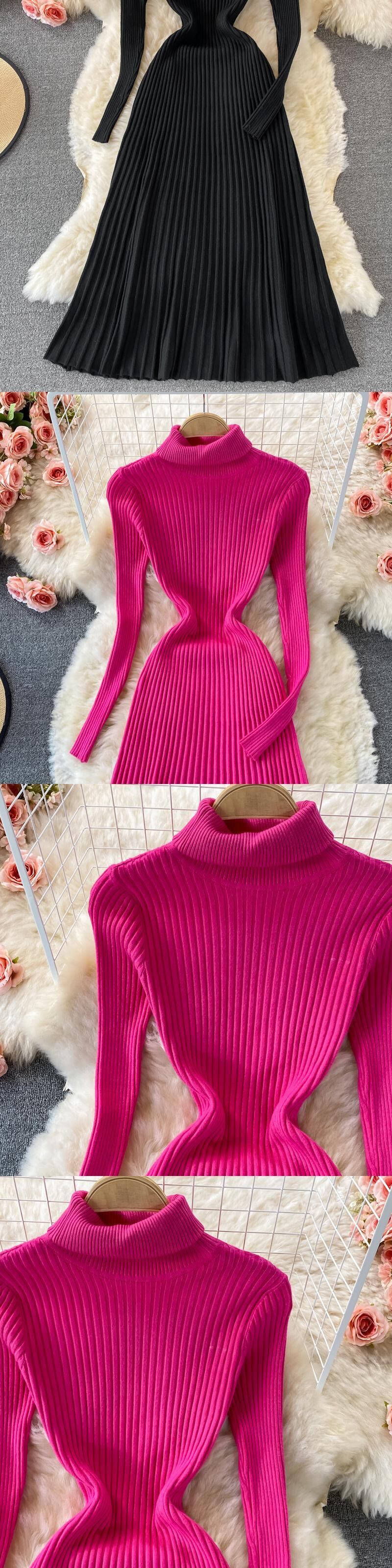 女性プリーツニットドレススタンドカラー長袖弾性スリムペンシルドレス秋冬セクシーなボディコンセータードレス ロング エラスティック 伸縮 オータム 秋物 ウィンター 冬物 Abe40011351950