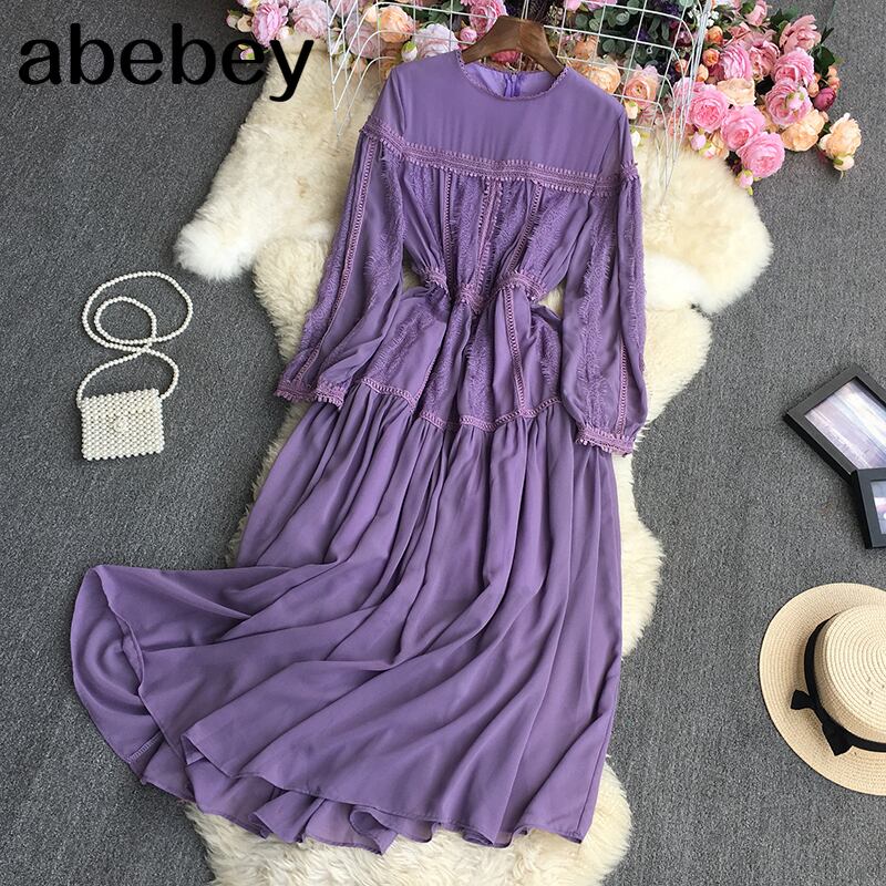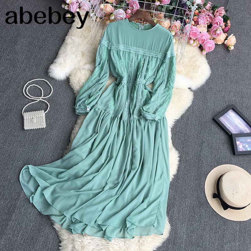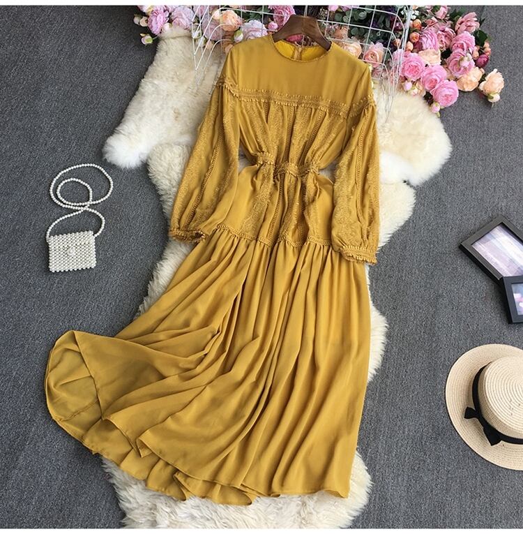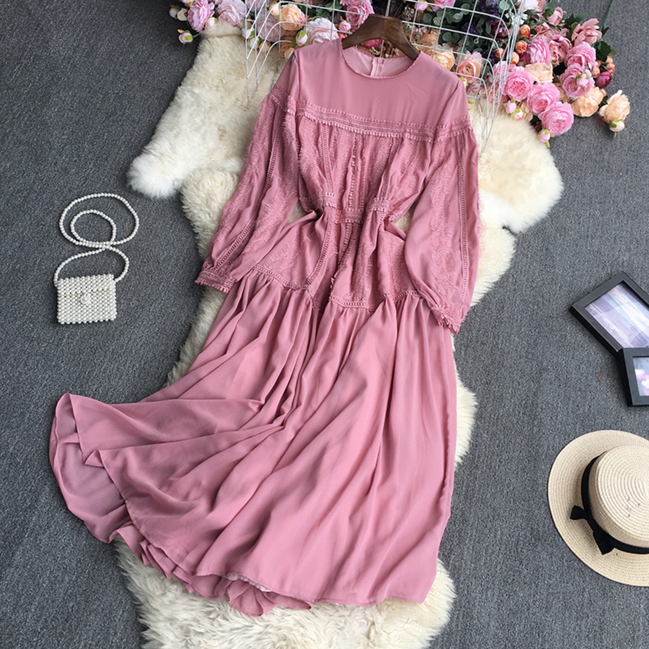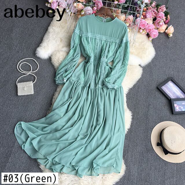 2022 春秋 O ネック長袖ドレスレースパッチワークハイウエストロング無地 A ラインプリーツドレス ハイウェスト スプリング 春物 オータム 秋物 Oネック Aライン ソリッドカラー Abe84183896603