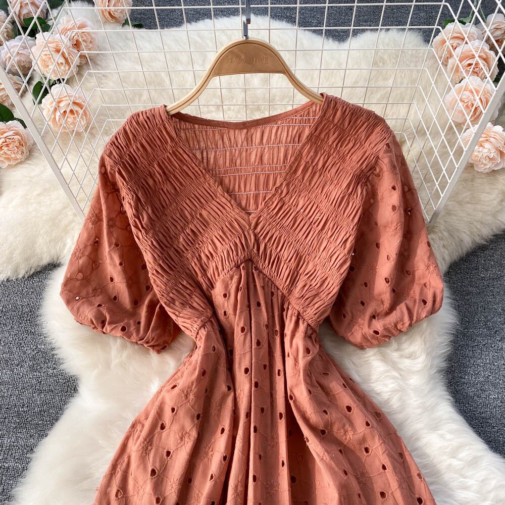 シックな中空ドレス パフ スリーブ V ネック無地 A ライン ドレス夏休みミディ サンドレス サマー 夏物 Vネック Aライン ソリッドカラー Abe39311966207