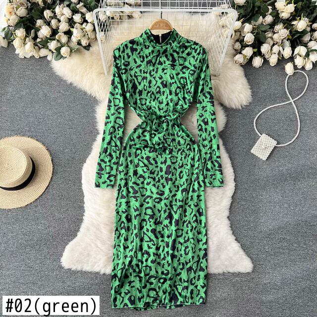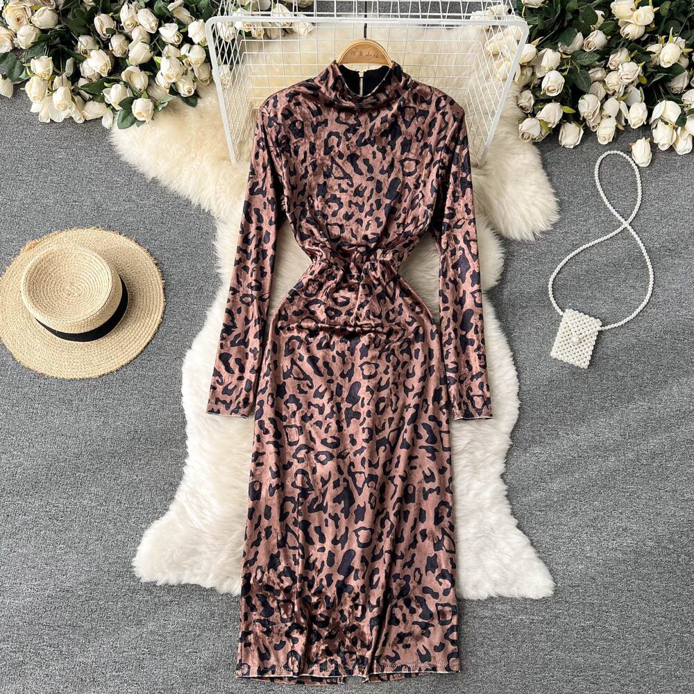 レトロなヒョウ柄ドレス女性スタンドカラー長袖ドレスジッパースプリットベロアドレス春 ロング スプリング 春物 Abe79470971878