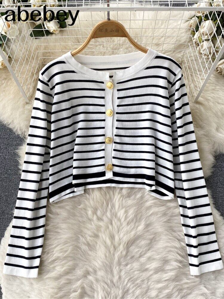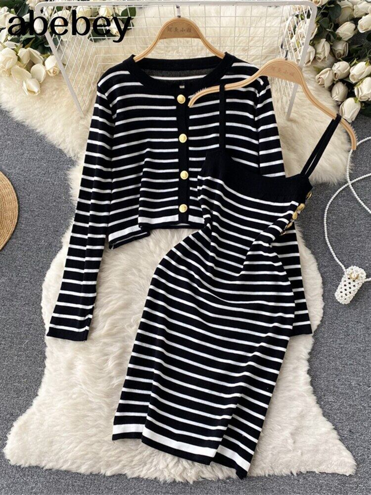 ストライプ ニット ツーピース スーツ ボタン長袖カーディガン トップ + 弾性ウエスト キャミソール ドレス秋のセット ロング エラスティック 伸縮 オータム 秋物 Abe54456218696