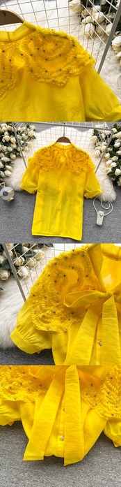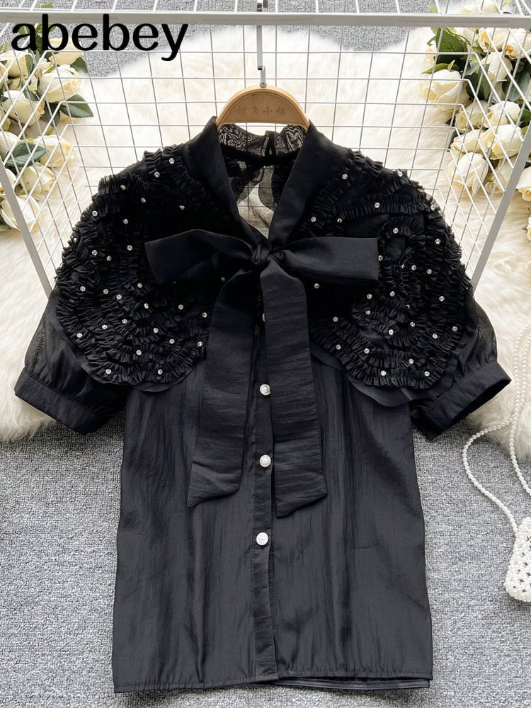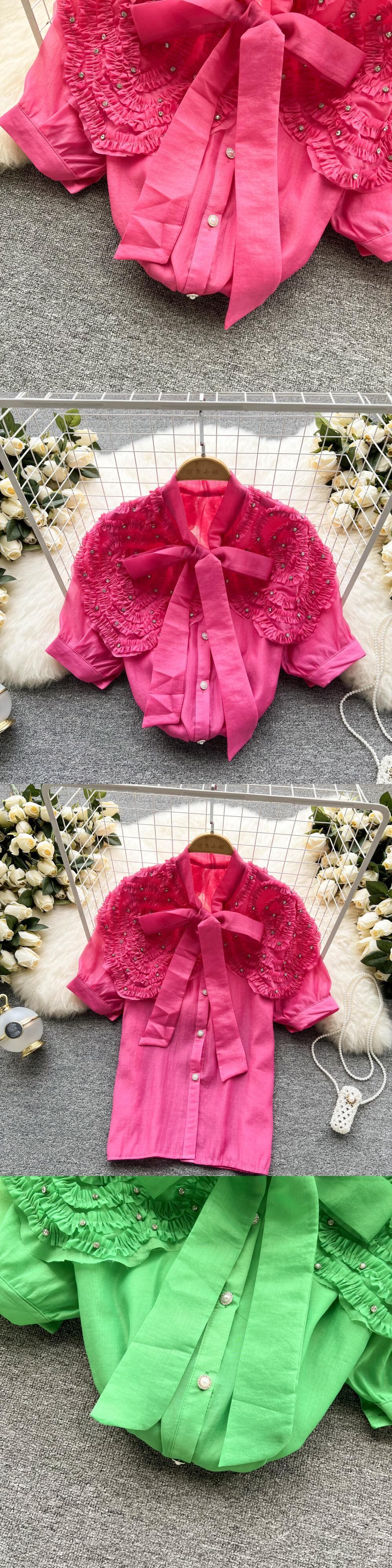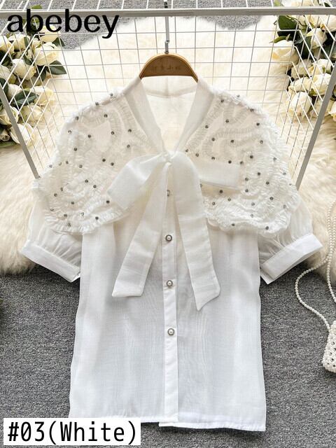 パッチワーク ダイヤモンド シャツ女性ちょう結び襟半袖ソリッド ブラウス スタイル 2022 ショート リボン ハーフスリーブ ソリッドカラー Abe5090140323