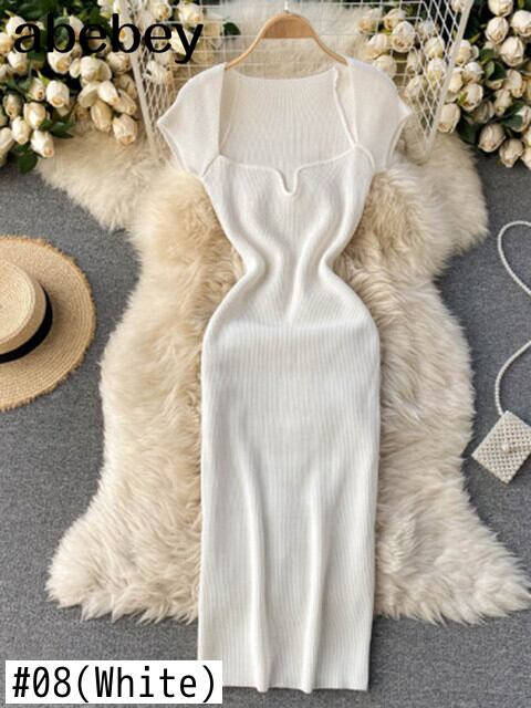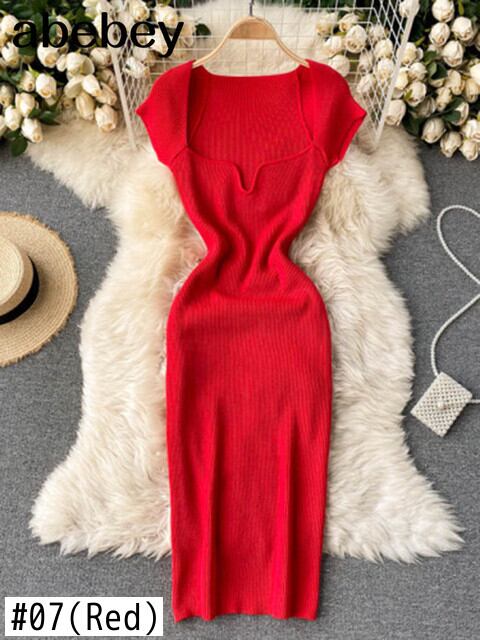 2022 春夏ドレスニット固体 Sqaure ネックセクシーなボディコンドレス女性ストレッチ Vestidos 半袖 19968 ショート ハーフスリーブ スプリング 春物 サマー 夏物 ソリッドカラー Abe25413059829