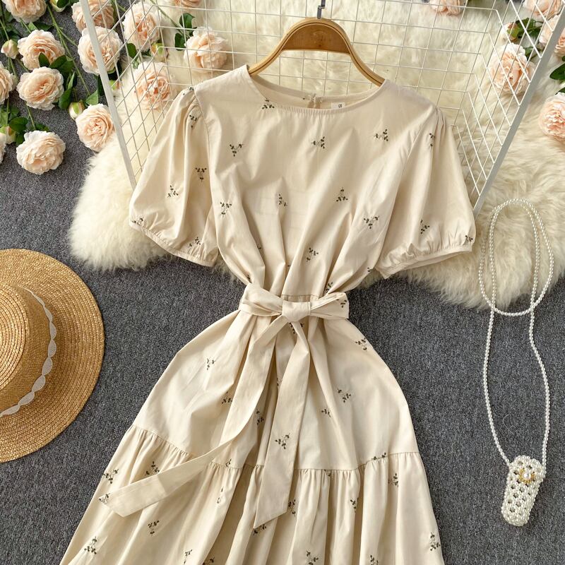 女性 2022 ドレスボヘミアン刺繍花 O ネック半袖ウエストプリーツドレスオールマッチ Vestidos ショート レッド ハーフスリーブ Oネック フラワーデザイン Abe9620358199