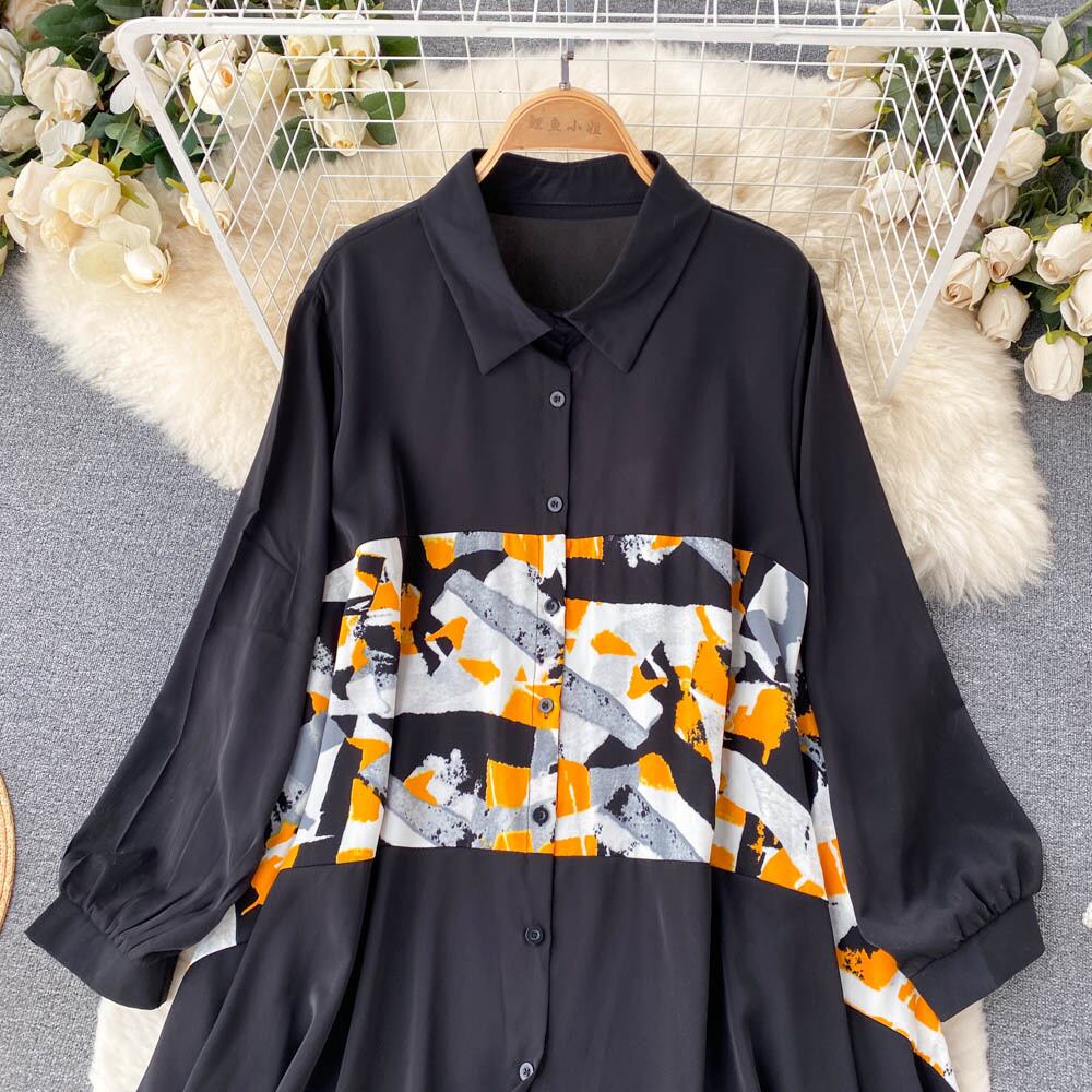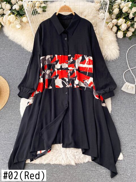 夏の滑走路不規則なプリーツ ドレス女性の長袖シャツの襟オーバーレイ フラワー プリント スリム パーティー ミディ ドレス ロング サマー 夏物 フラワーデザイン Abe57501733592