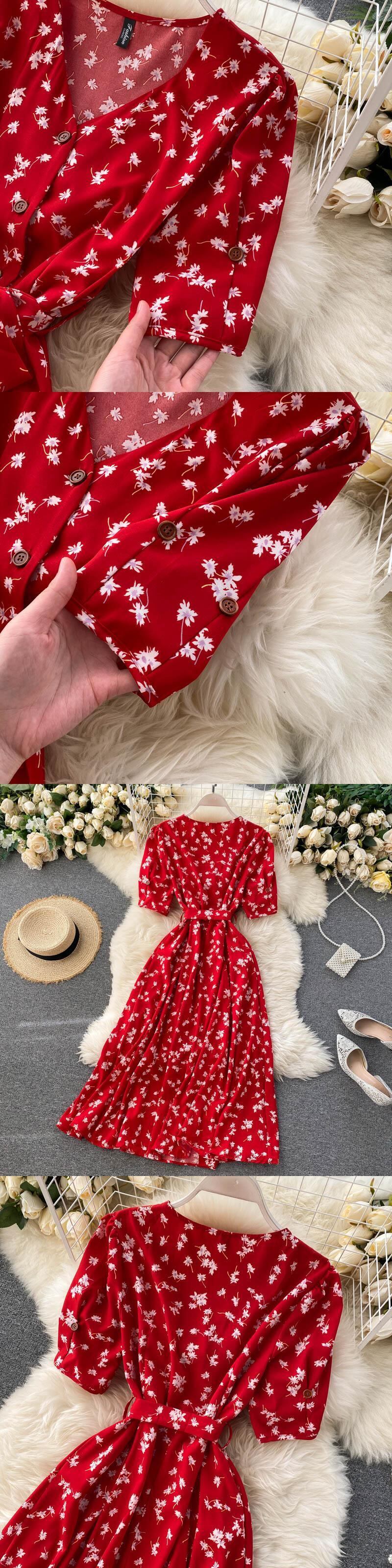 2022 赤のエレガントなセクシーなドレスの女性の夏秋の V ネック水玉ミディドレスウエストスプリットドレス vestidos デフィエスタ服 レッド サマー 夏物 オータム 秋物 Vネック Abe24134130191