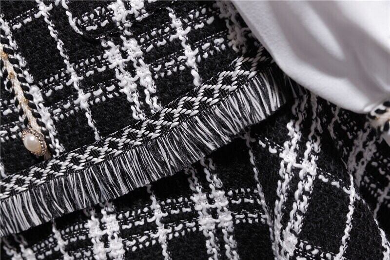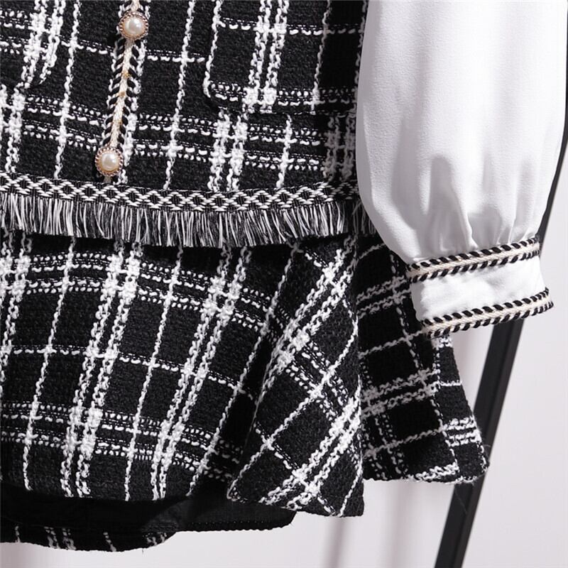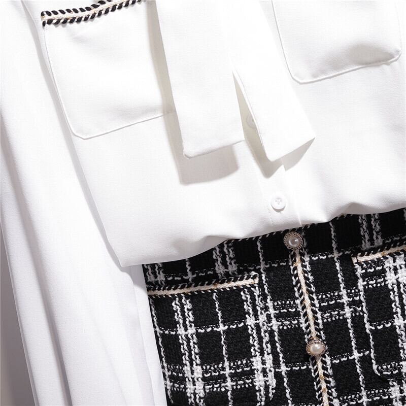 女性 2 ピース セット 2020 春白シフォンちょう結びシャツ トップス + 黒チェック柄ツイード マーメイド スカート セット ホワイト ブラック リボン スプリング 春物 Rhc79911633353
