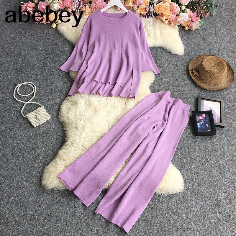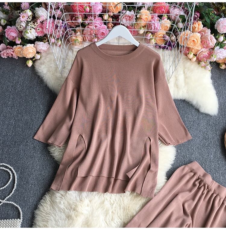 2022年春秋Oネック長袖ニットスプリットトップス+ハイウエスト無地ゆったりカジュアルワイドパンツ2点セット ハイウェスト ロング スプリング 春物 オータム 秋物 ワイドレッグ ソリッドカラー Abe70564897158