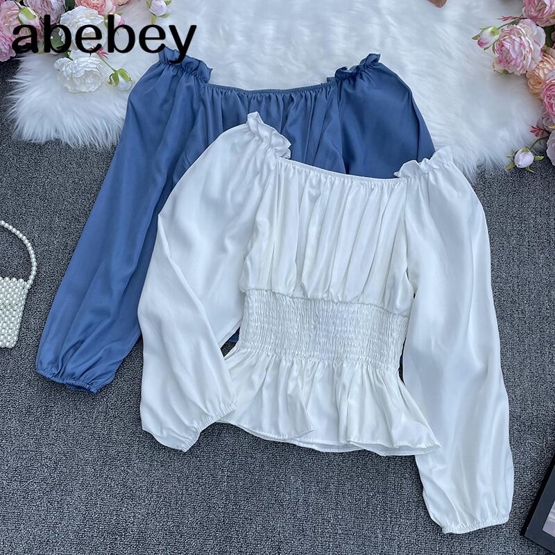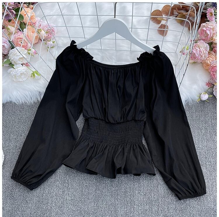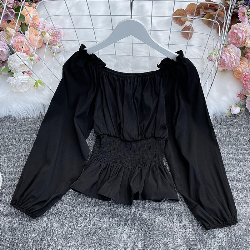 2022春 オールマッチ スラッシュネック オフショルダー ブラウス シャーリング ウエスト スリム フリル シャツ トップス スプリング 春物 Abe52425681189