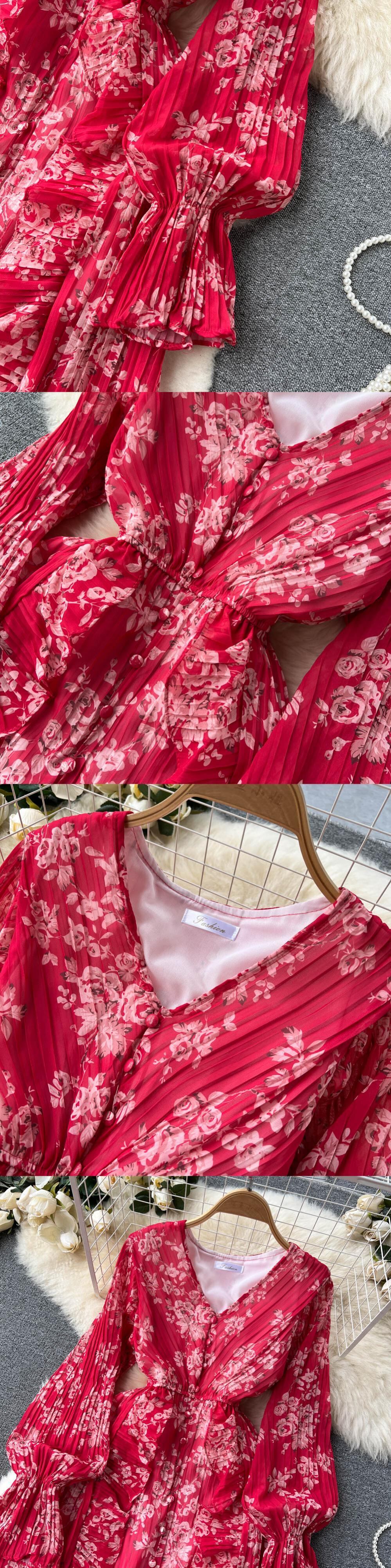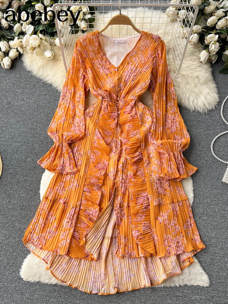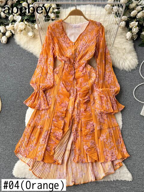 秋の女性の花シフォン ドレス ボヘミアン バケーション ビーチ V ネック フレア長袖ウエスト シングル ブレスト フリル Vestido ロング オータム 秋物 花柄 Vネック Abe97395254161
