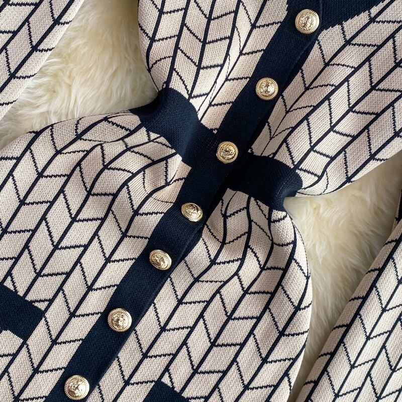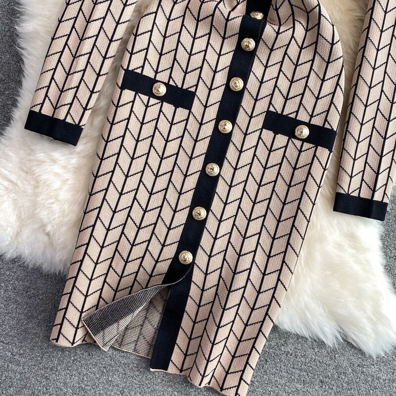春秋の女性のセクシーな V ネック長袖スリム ドレス ジオメトリ シングル ブレスト ニット ドレス ロング スプリング 春物 オータム 秋物 Vネック Rhc5658794469