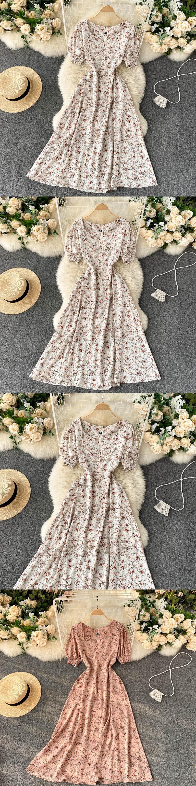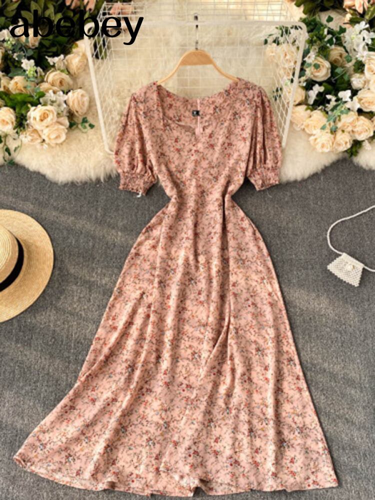 2022 自由奔放に生きる女性花プリントドレス V ネックパフスリーブドレス夏フリルビーチミディドレス ラッフル サマー 夏物 花柄 Vネック Abe12449869822