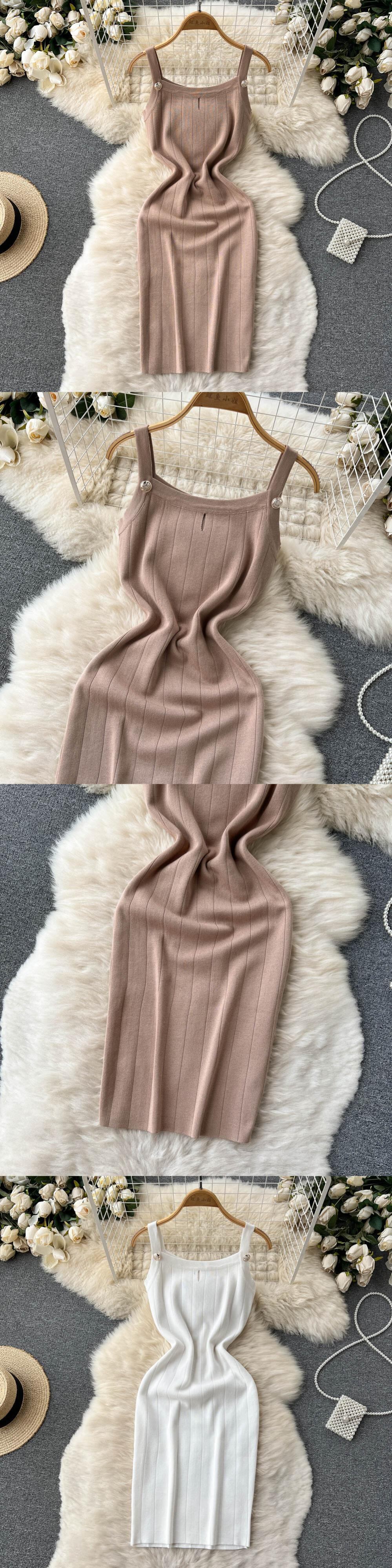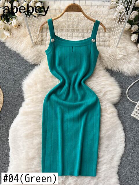 2022 ニットグリーンミディセクシーなボディコン女性ドレス春スパゲッティストラップボタンドレスシックなセータークラブパーティードレス スプリング 春物 Abe64445092620