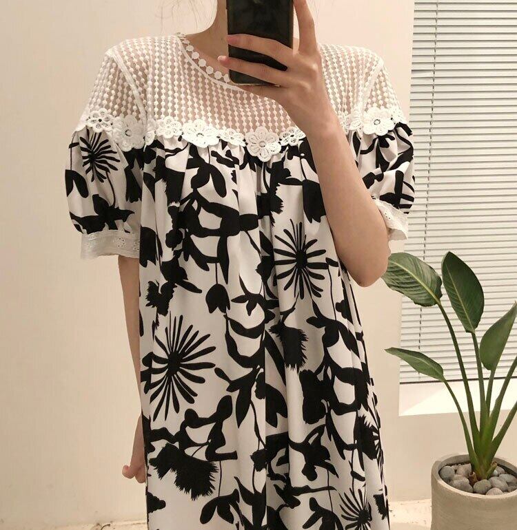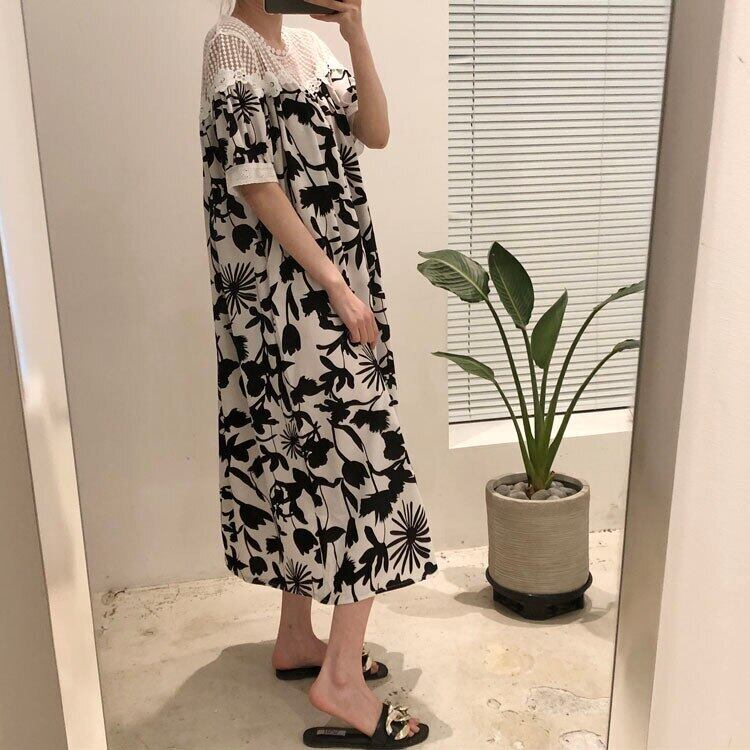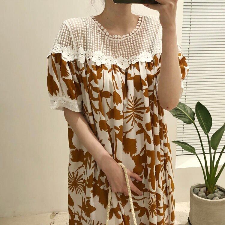 レーススプライシング女性ドレスパフスリーブプリントフローラルミディドレスワンピースルーズパーティードレス 花柄 Rhc9950029816