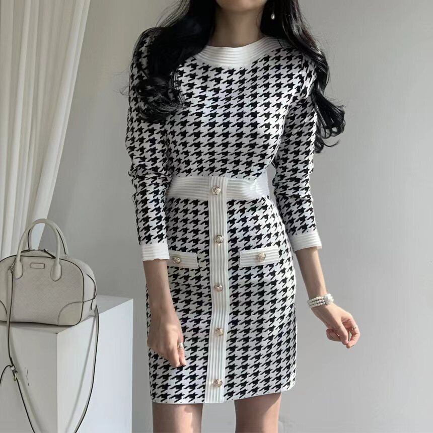 千鳥格子セータードレス女性 Fashiion セクシーな O ネック長袖 Traf ボディコンドレス服 ロング Oネック Rhc52178982453