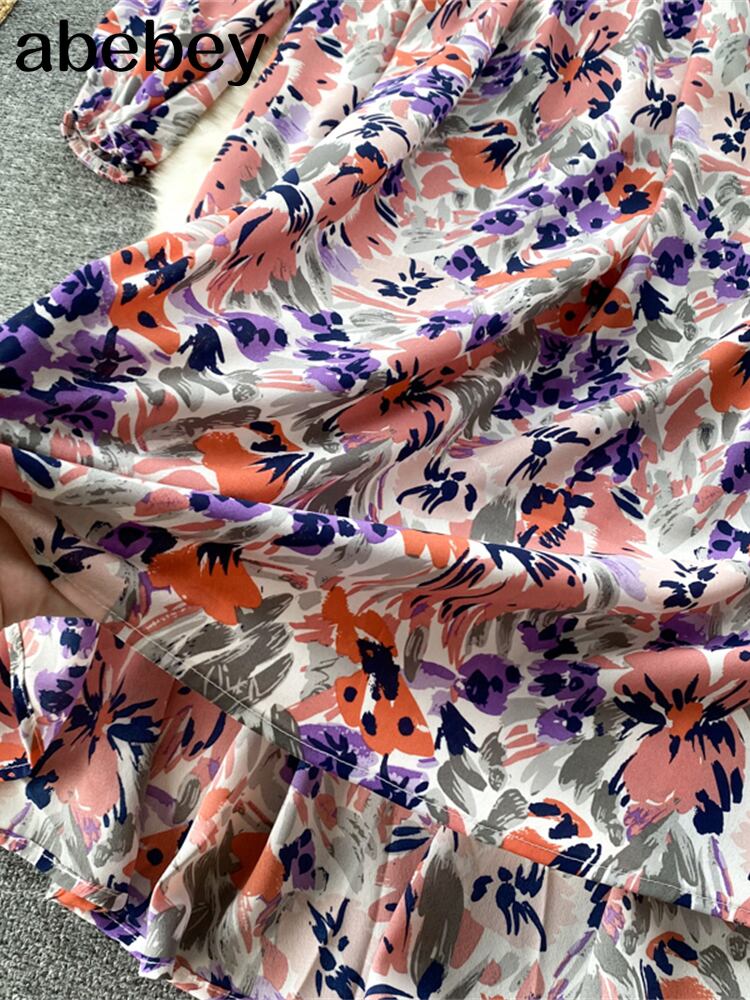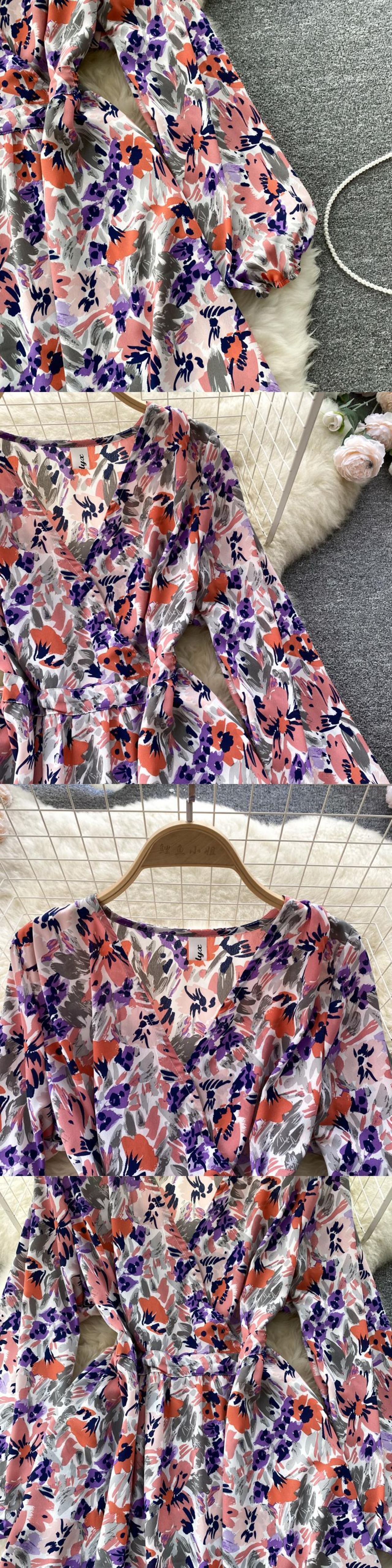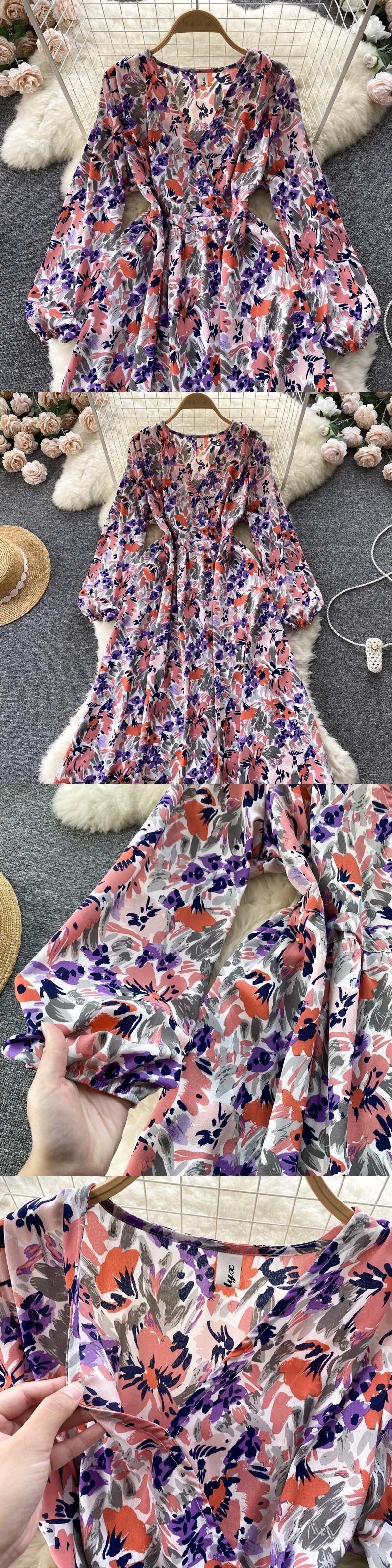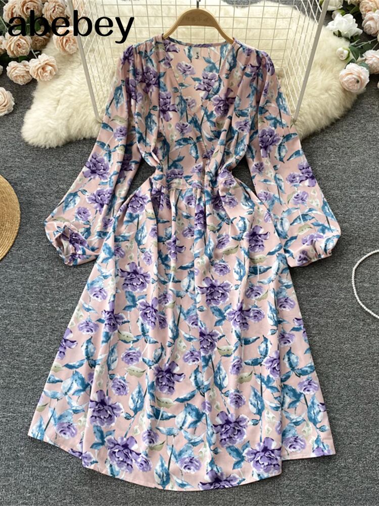 春秋の女性プリント V ネック パフ スリーブ ドレス ホリデー スタイル ウエスト A ライン ミディアム ロング ドレス スプリング 春物 オータム 秋物 Vネック Aライン Abe93588582410
