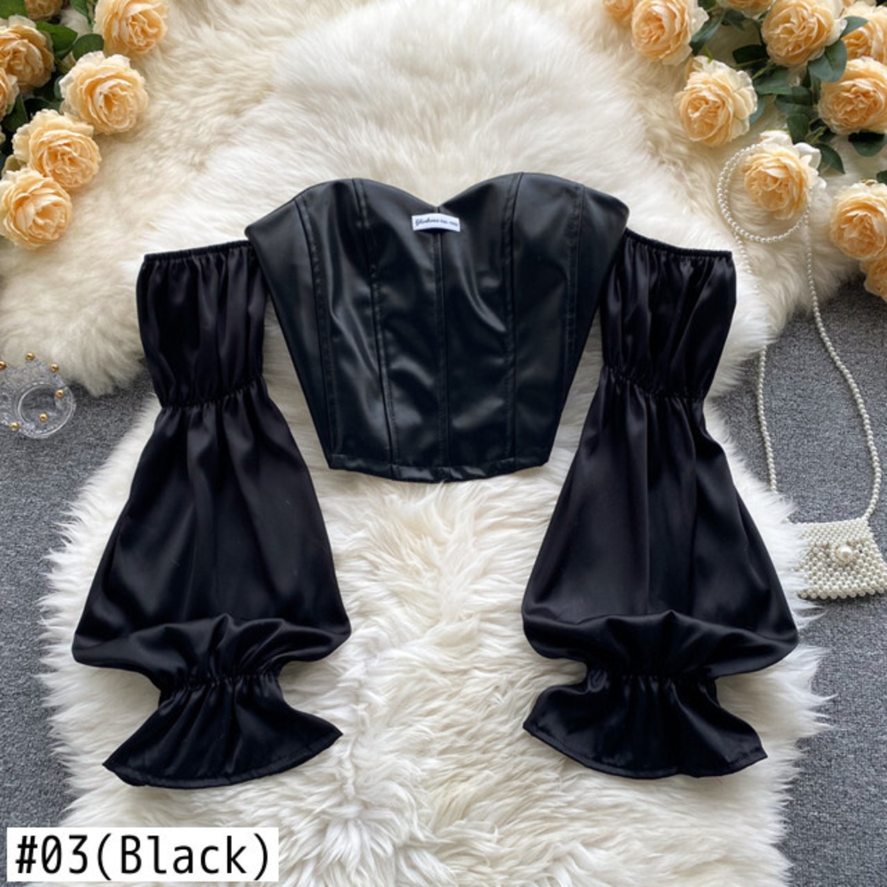 セクシーなフェイクレザーストラップレストップス女性長袖ソリッドジッパースリムトップス春オフショルダー PU レザーショートシャツ ロング スプリング 春物 ファー ソリッドカラー Abe71464173500