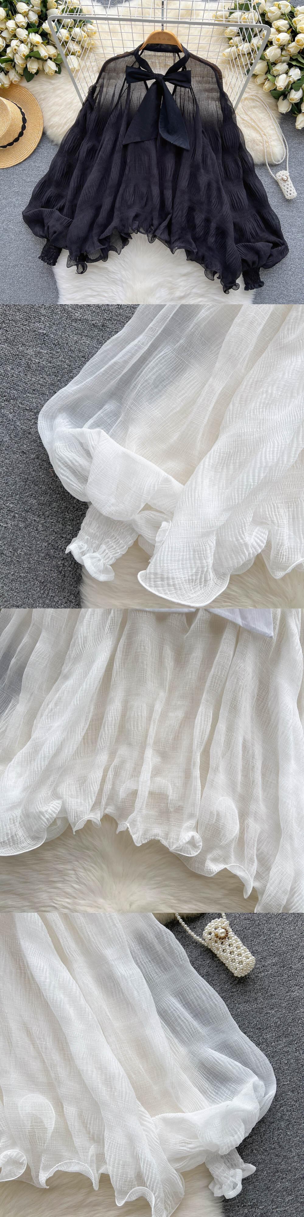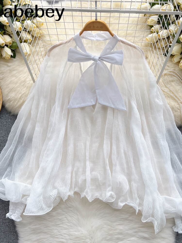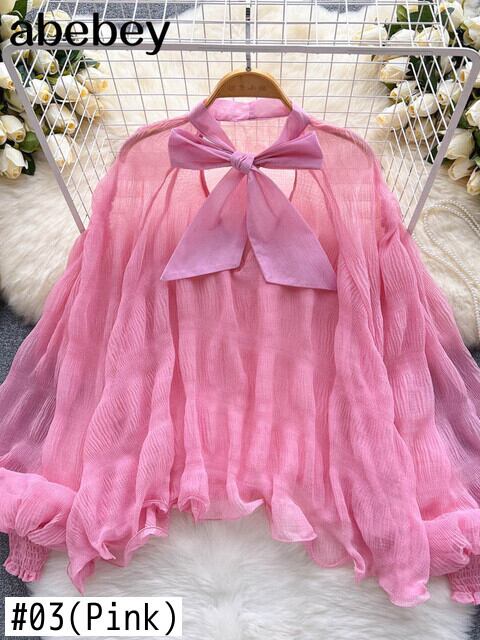 女性シフォン弓薄いフリルシャツスタイルランタン長袖気質秋夏女性ブラウス 2022 ロング リボン ラッフル サマー 夏物 オータム 秋物 Abe45074613908