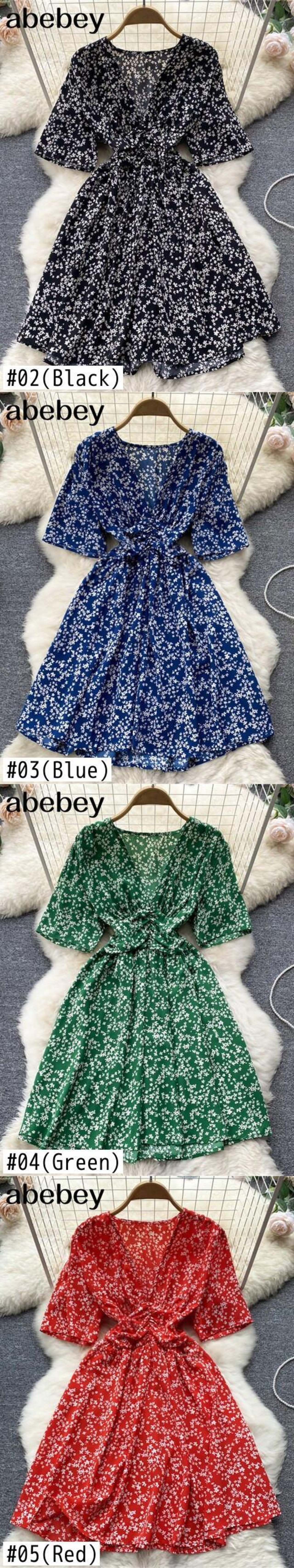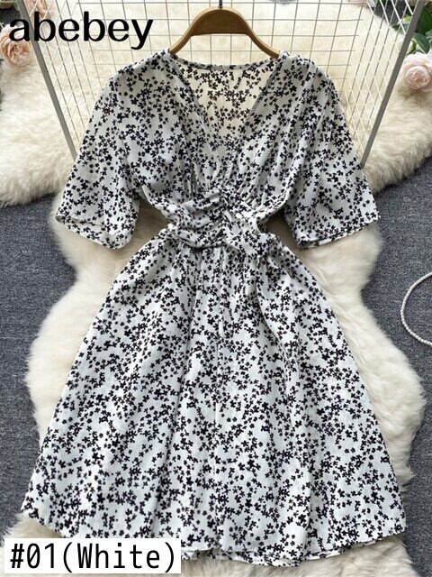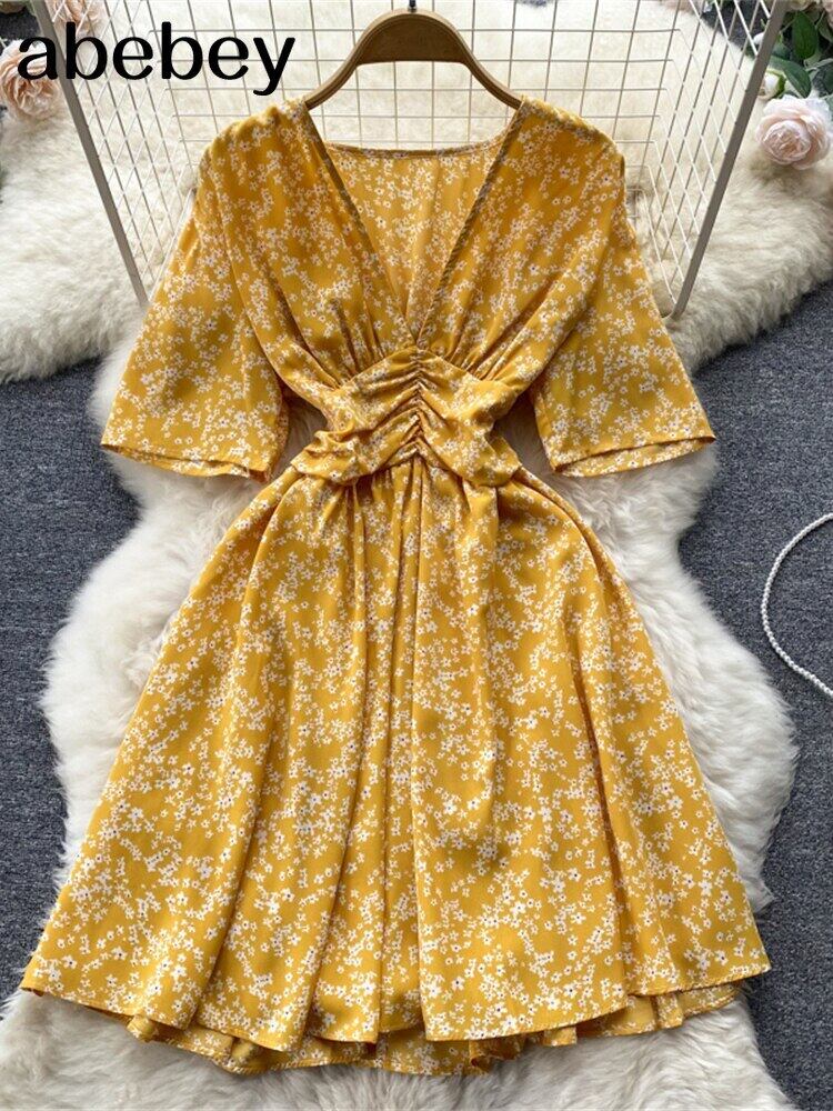 夏らしいAラインドレスVネック花柄ミニドレスフレア半袖ボタンパーティードレスVestido De Mulher ショート ハーフスリーブ サマー 夏物 Abe12140010970