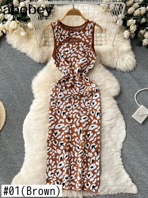 ニットリブドレスセクシーなタンクミディドレス女性パーティークラブノースリーブヒョウ柄ドレスボディコン包帯 Abe9829057808