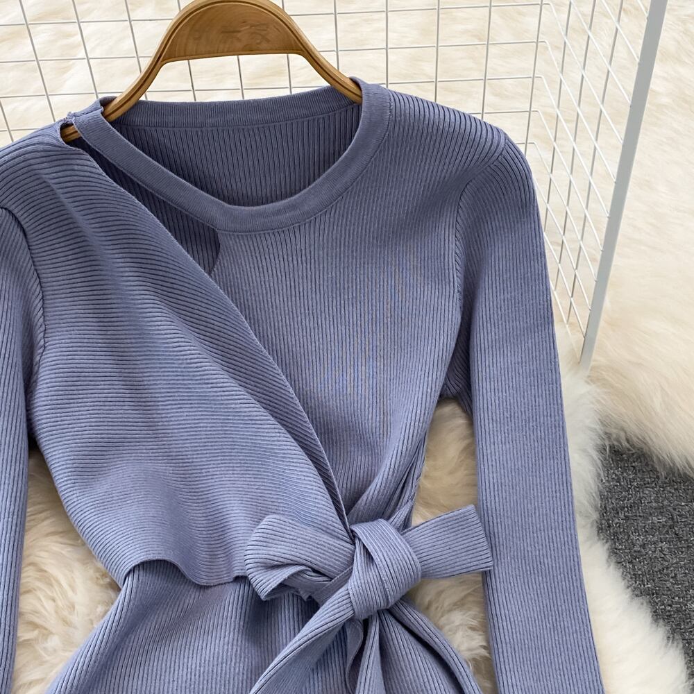 2022 ボウ女性ニットペンシルドレス長袖 O ネック弾性スリムドレス秋冬セクシーなボディコン暖かいセータードレス ロング リボン エラスティック 伸縮 オータム 秋物 ウィンター 冬物 Oネック Abe16059611121
