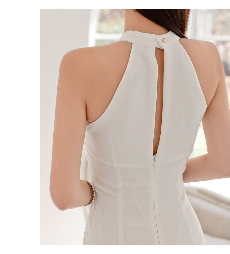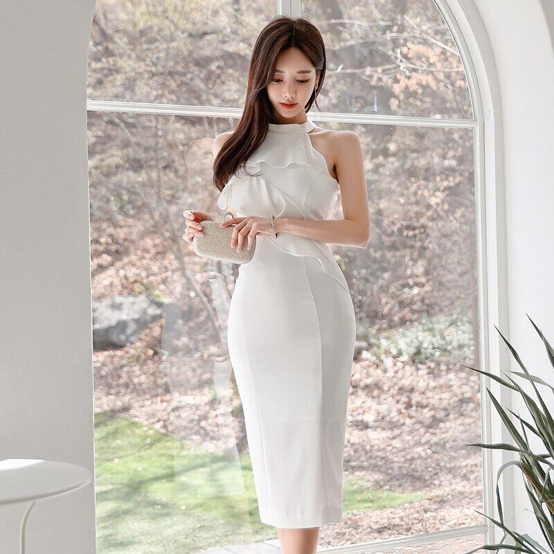 夏の女性フリルシースボディコンドレスホルターノースリーブホワイトイブニングパーティードレス女性ソリッドバックレスドレス ラッフル サマー 夏物 ソリッドカラー Rhc28724789003