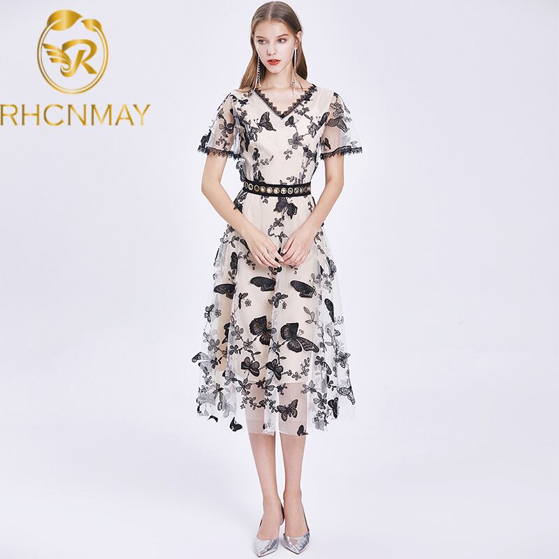 女性の滑走路 A ライン ドレス夏セクシーな V ネック蝶刺繍ウエスト メッシュ ホリデー ロング ドレス サマー 夏物 Vネック Aライン Rhc9383830460