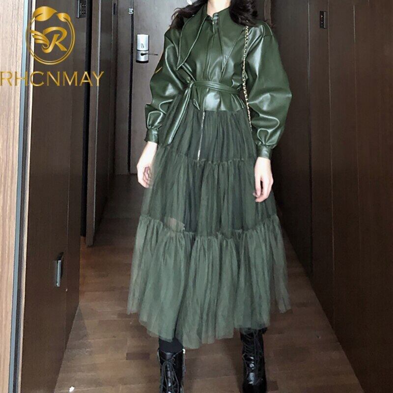滑走路 2020 春ジャケット女性パッチワークロングメッシュガーゼステッチ PU レザーコートベルト スプリング 春物 ハーネス Rhc19890017598