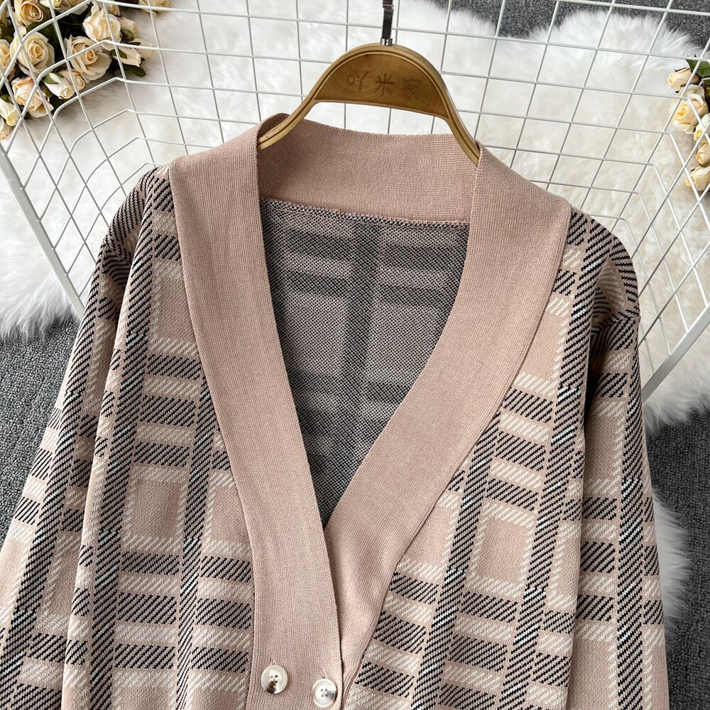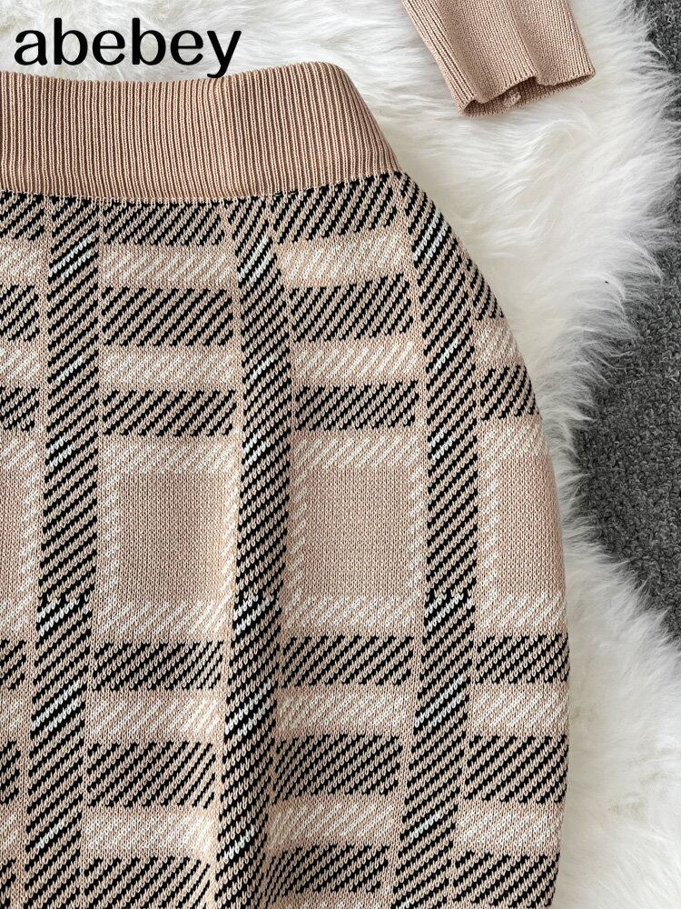 秋冬女性セットセーター緩いチェック柄ニットカーディガン + スカートセットアンサンブル 2 個 2022 オータム 秋物 ウィンター 冬物 Abe64551041310