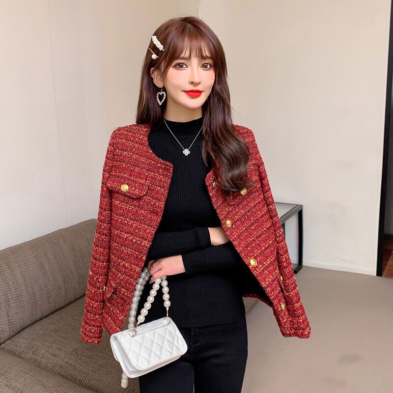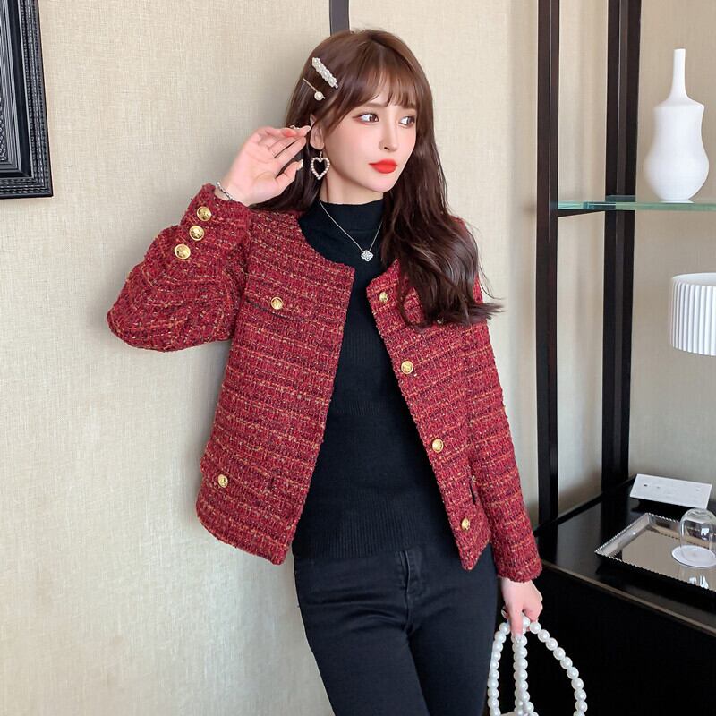 秋の小さな香りレッド ツイード ジャケット コート長袖ラウンド ネック シングル ブレスト オフィス レディ アウター ロング オータム 秋物 Oネック 会社 学校 通勤や通学にも Rhc69505518186