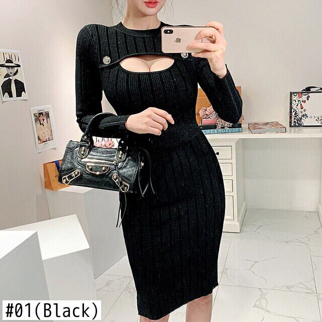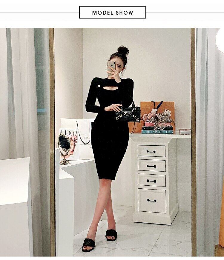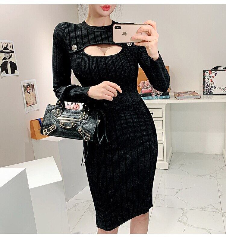 2020 女性のセクシーなニット黒ドレス長袖 O ネック中空アウト膝丈パーティードレスの女性のドレス ロング ブラック Oネック Rhc75585762494