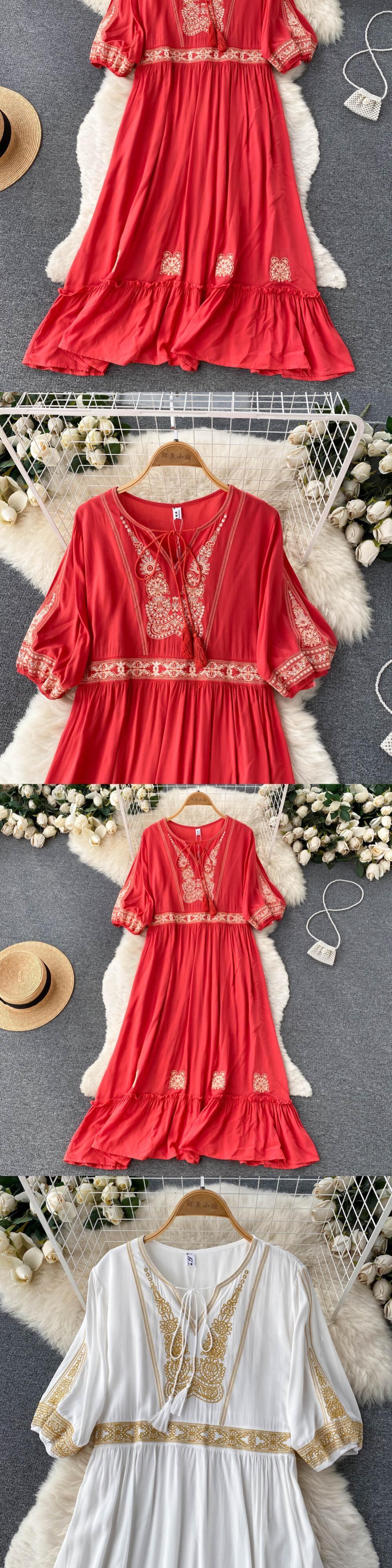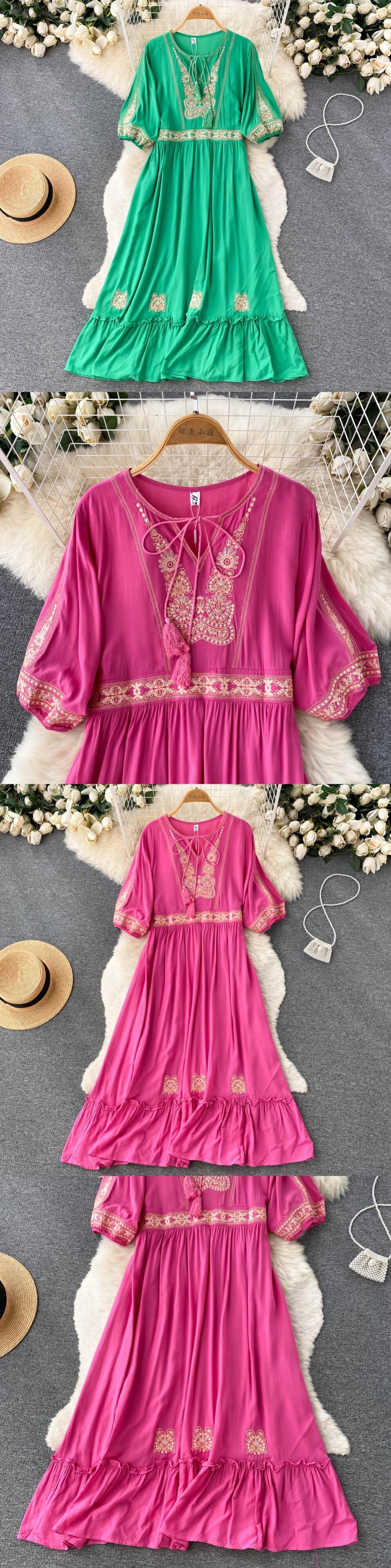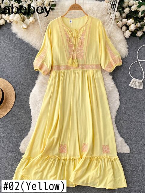 自由奔放に生きる花刺繍半袖ルーズ ボヘミアン スタイル マキシ ヒッピー ロング ドレス フォーク Vestidos ショート ハーフスリーブ 花柄 Abe20931045989