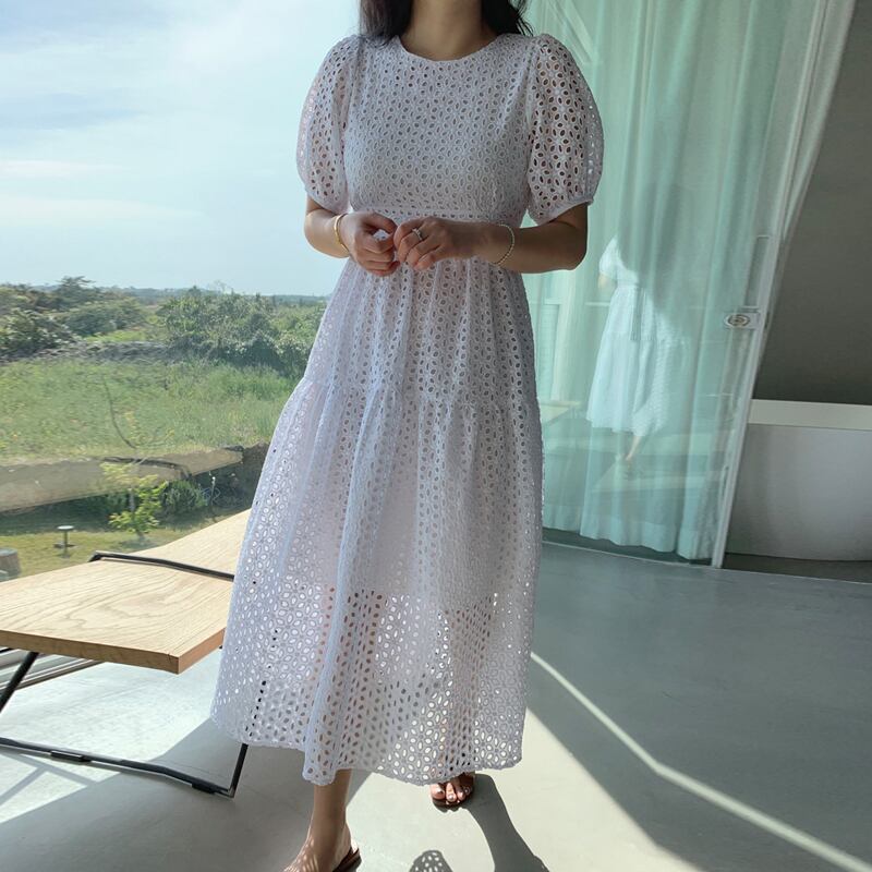 2021夏シック気質レース中空アウトパフスリーブウエストロングドレスミッドカーフショート無地ドレス サマー 夏物 ソリッドカラー Rhc50809910032