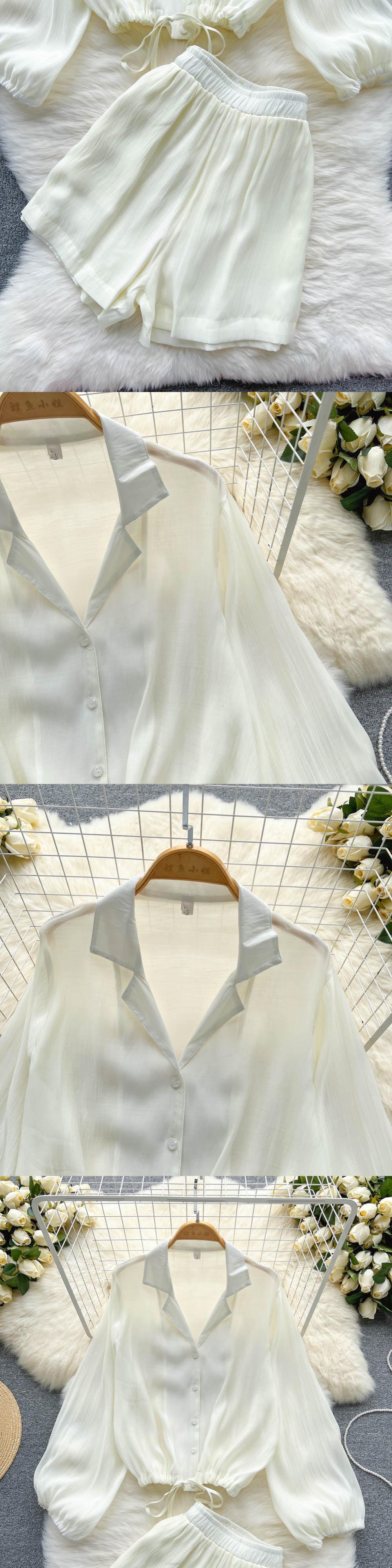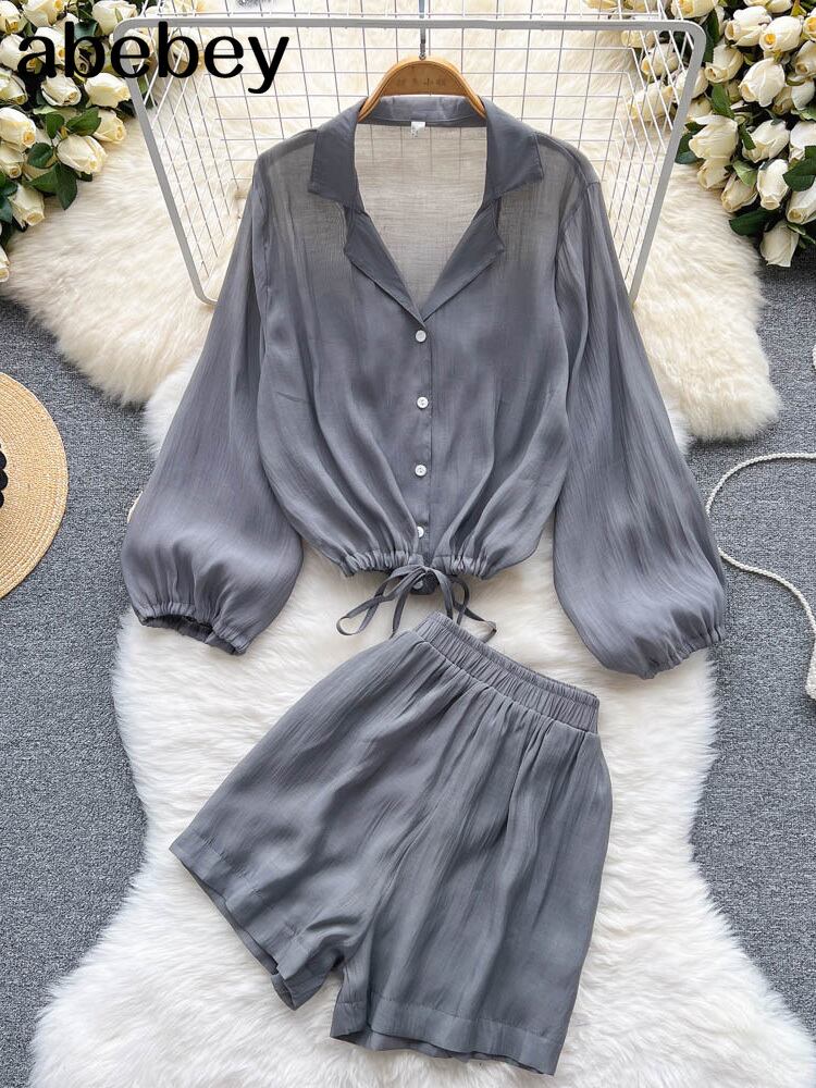 夏の滑走路のツーピースの服の女性長袖無地ブラウスとショーツスーツ衣装 ロング サマー 夏物 ブルマー ソリッドカラー Abe41330674440
