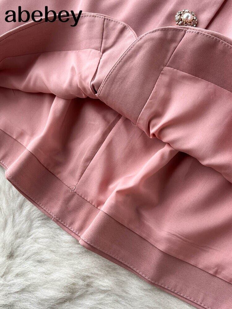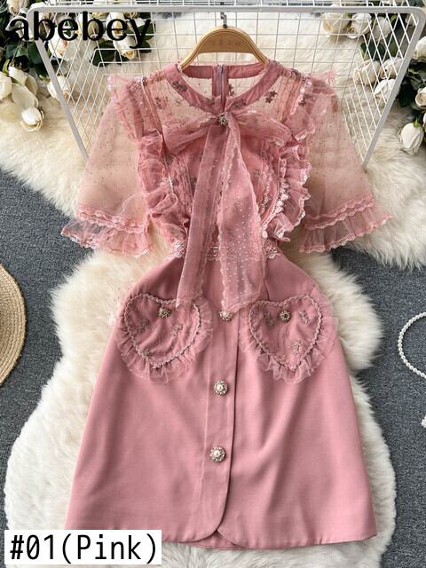 2022 滑走路女性ピンクショートドレス春シフォンパッチワークレース O ネックランタンスリーブプリーツドレス スプリング 春物 Oネック Abe32203548102