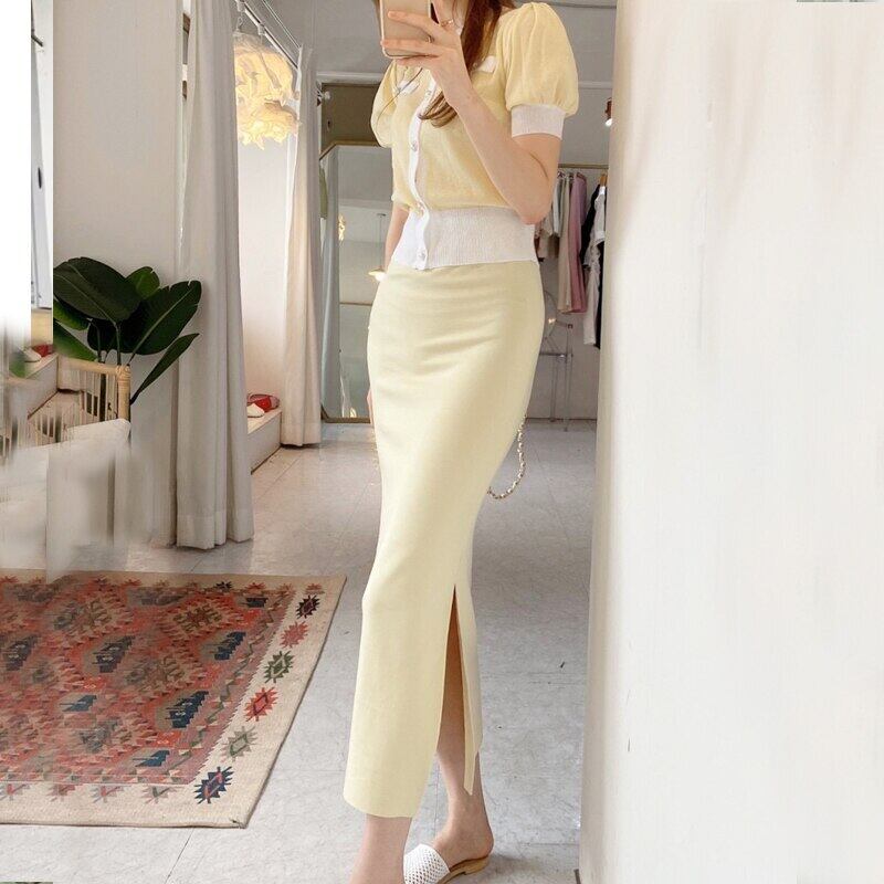 2021 夏女性の 2 点セットパフスリーブカーディガン O ネックセータートップス + 弾性ウエストスカートニットスーツ エラスティック 伸縮 サマー 夏物 Oネック Rhc87884425375