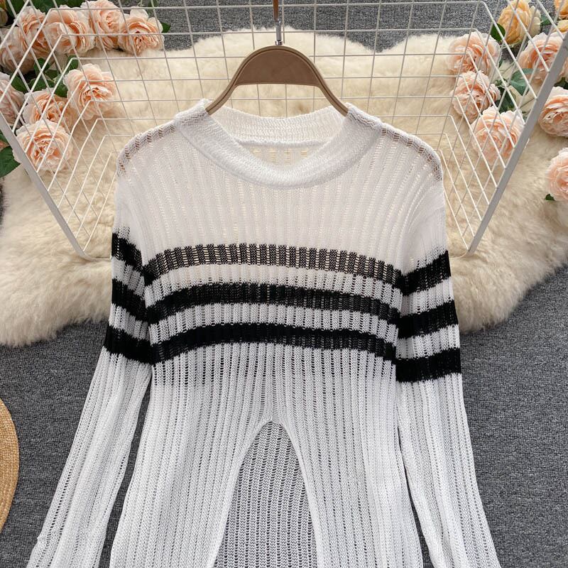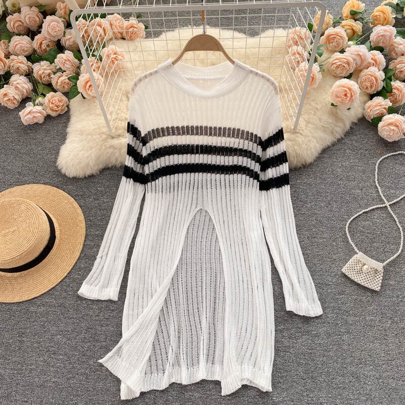 女性中空ニットブラウス長袖 O ネックルーズストライプトップス 2022 秋のスプリットロングブラウス オータム 秋物 Oネック Abe59852398710