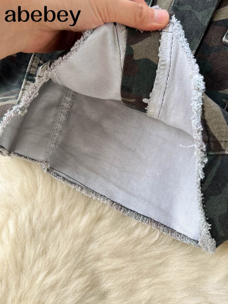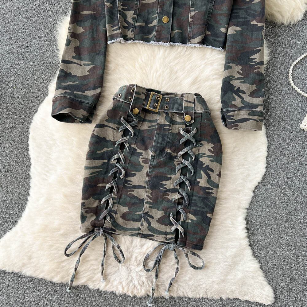 迷彩デニムツーピーススーツ秋の長袖デニムコート + ウエストボディコンミニスカートポケットセット ロング オータム 秋物 Abe84530517464