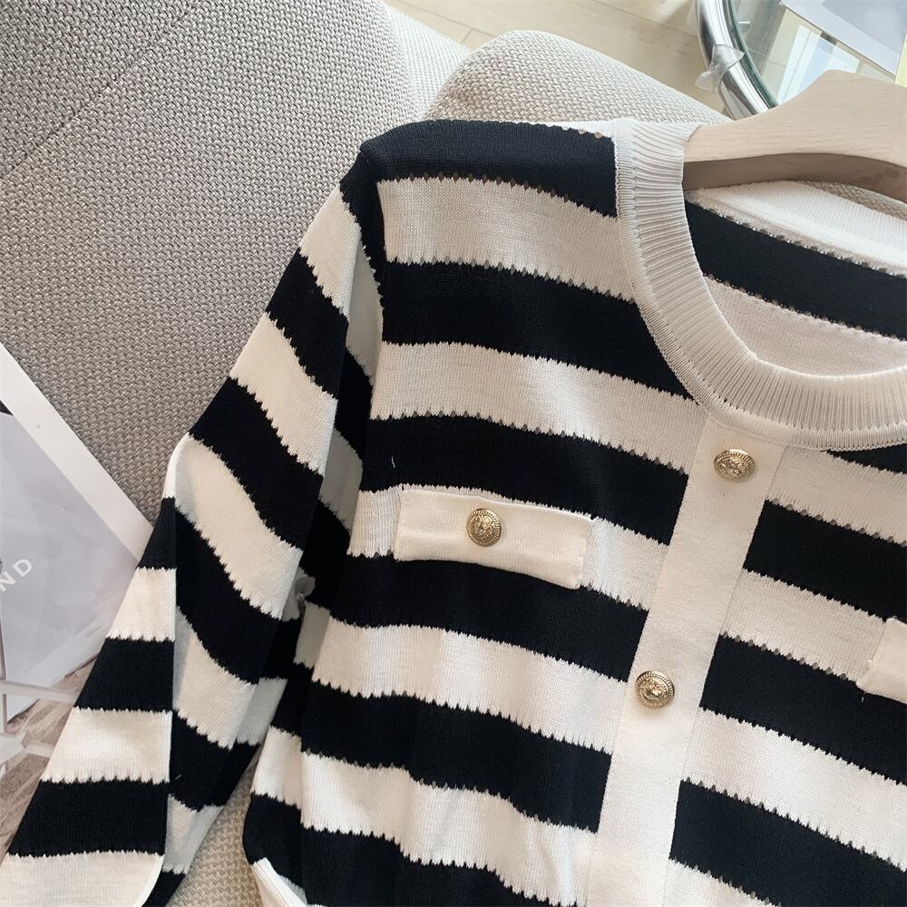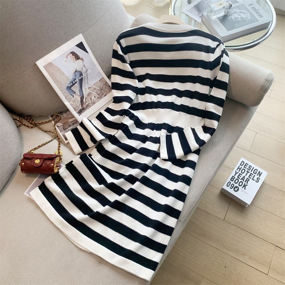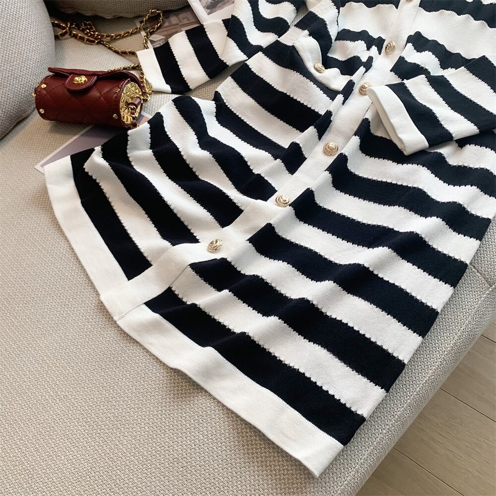 秋のセータードレス女性服ゴールドラインストライプボタンアップ V ネック長袖ストリートニットボディコンドレス ロング オータム 秋物 Vネック Rhc1183939698