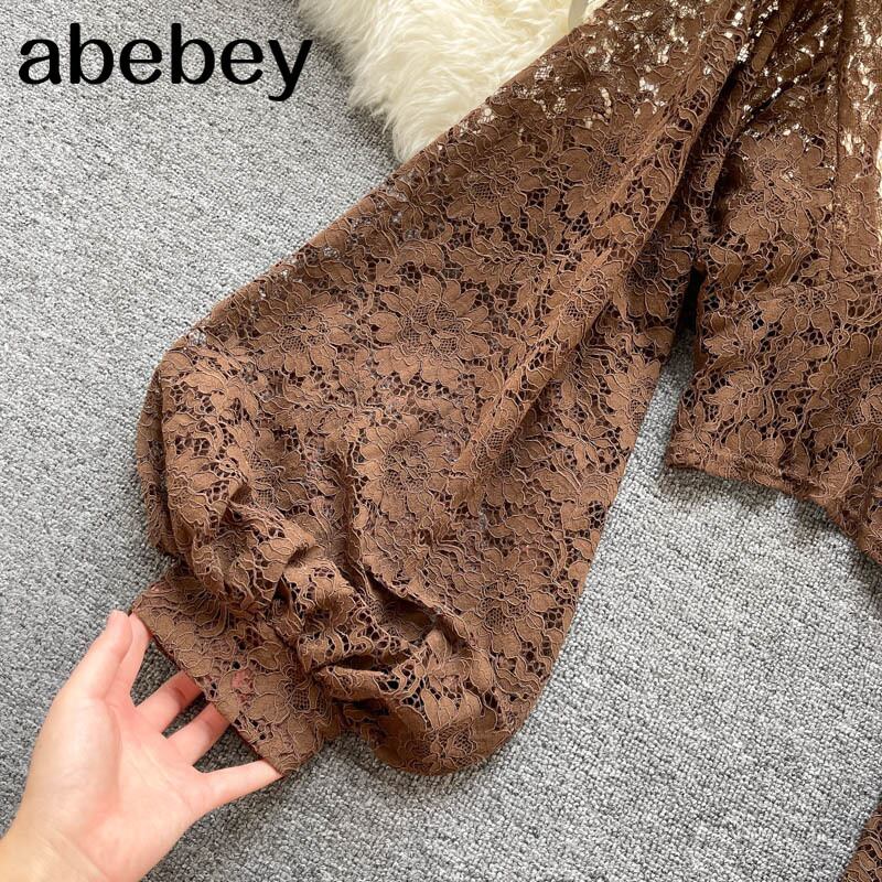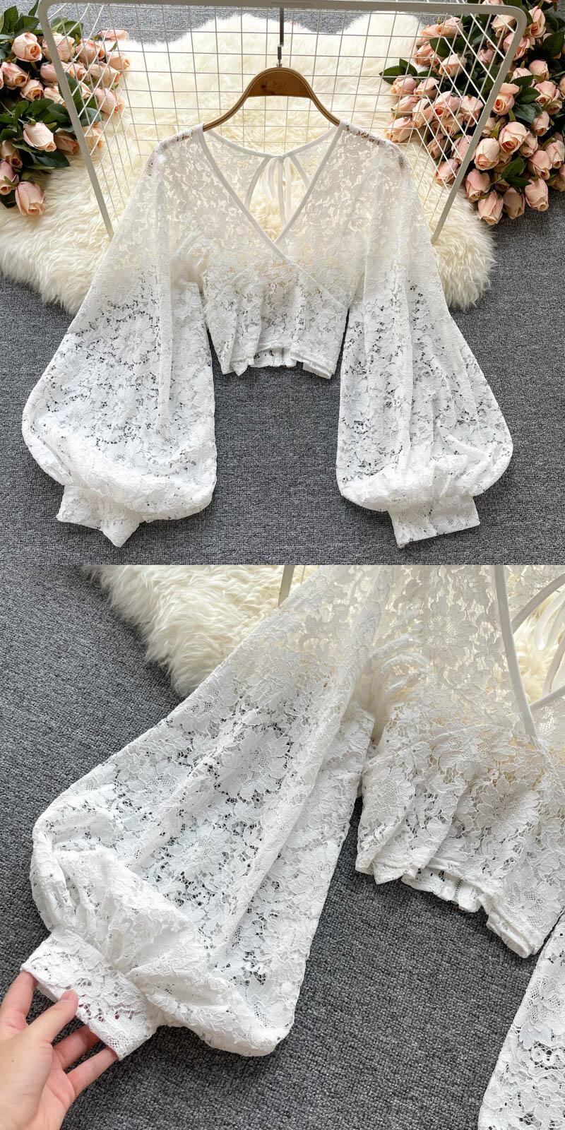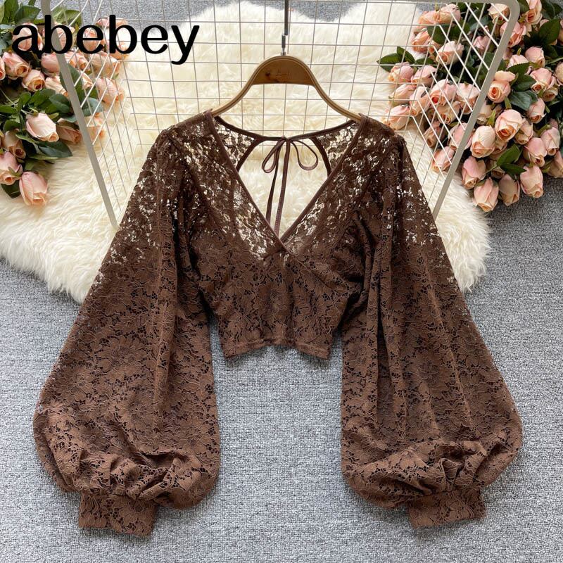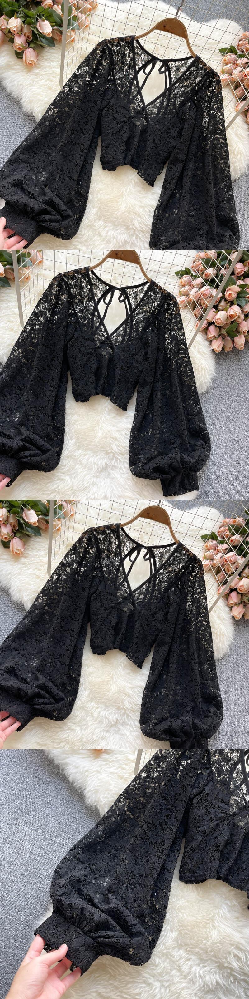 秋黒/白/ブラウンセクシーなレースブラウス女性 V ネックパフ長袖オープンバックショートトップスパーティー 2022 ロング ホワイト ブラック オータム 秋物 Vネック Abe16333190799